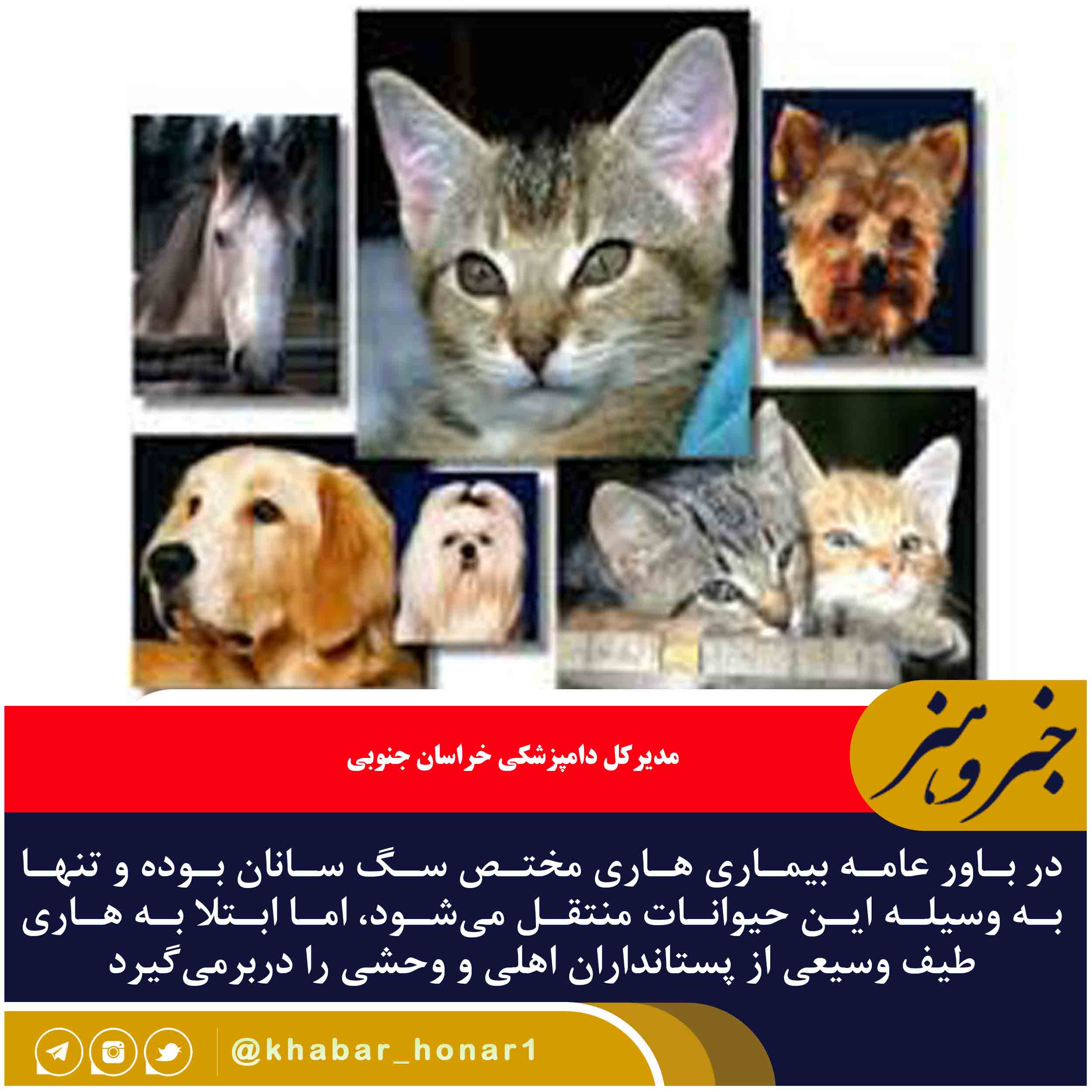 مدیرکل دامپزشکی خراسان جنوبی گفت: در باور عامه بیماری هاری مختص سگ سانان بوده و تنها به وسیله این حیوانات منتقل میشود، اما ابتلا به هاری طیف وسیعی از پستانداران اهلی و وحشی را دربرمیگیرد.