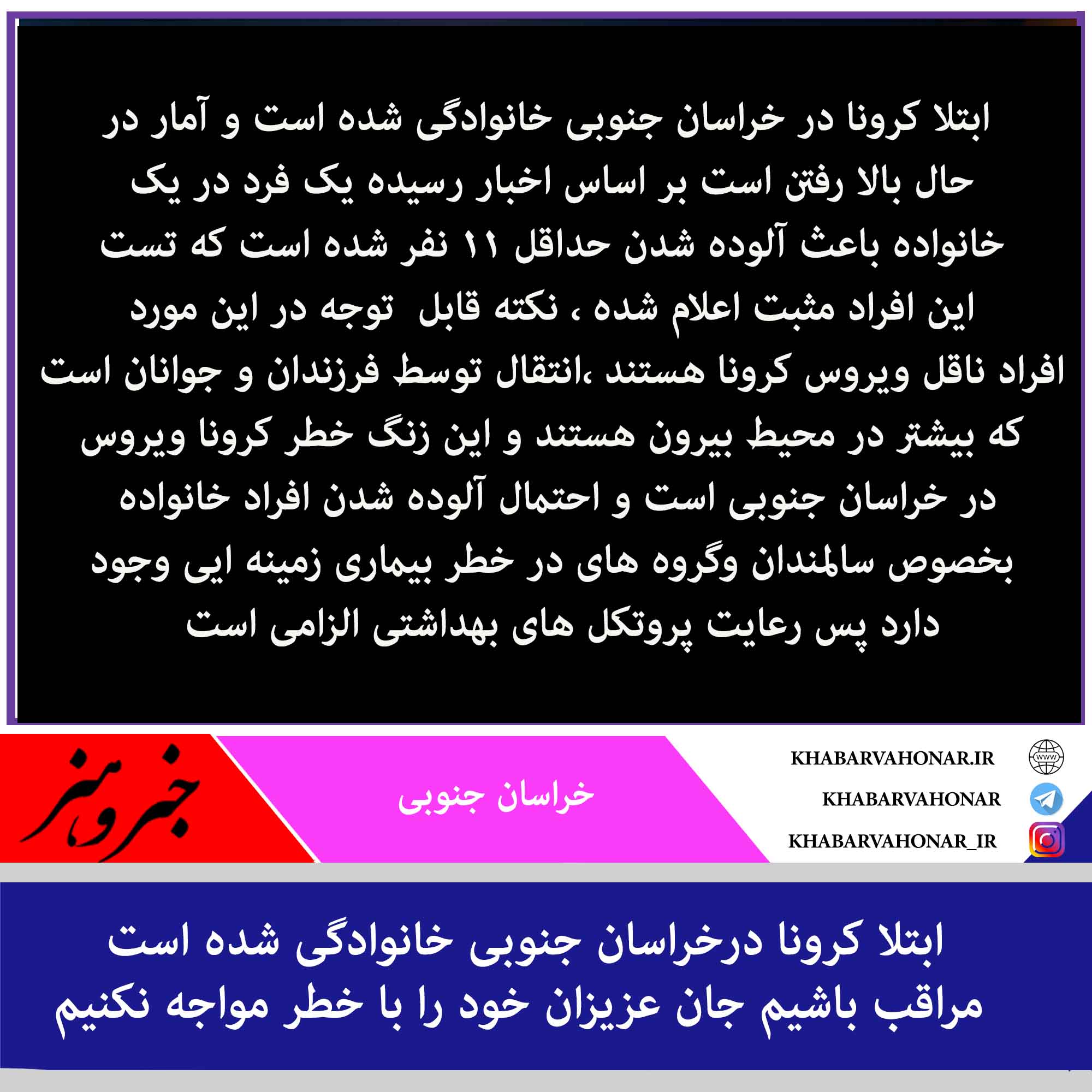ابتلا کرونا در خراسان جنوبی خانوادگی شده است و آمار در حال بالا رفتن است بر اساس اخبار رسیده یک فرد در یک خانواده باعث آلوده شدن حداقل ۱۱ نفر شده است که تست این افراد مثبت اعلام شده ، نکته قابل توجه در این مورد افراد ناقل ویروس کرونا هستند ،انتقال توسط فرزندان و جوانان است که بیشتر در محیط بیرون هستند و این زنگ خطر کرونا ویروس در خراسان جنوبی است و احتمال آلوده شدن افراد خانواده بخصوص سالمندان وگروه های در خطر بیماری زمینه ایی وجود دارد پس رعایت پروتکل های بهداشتی الزامی است