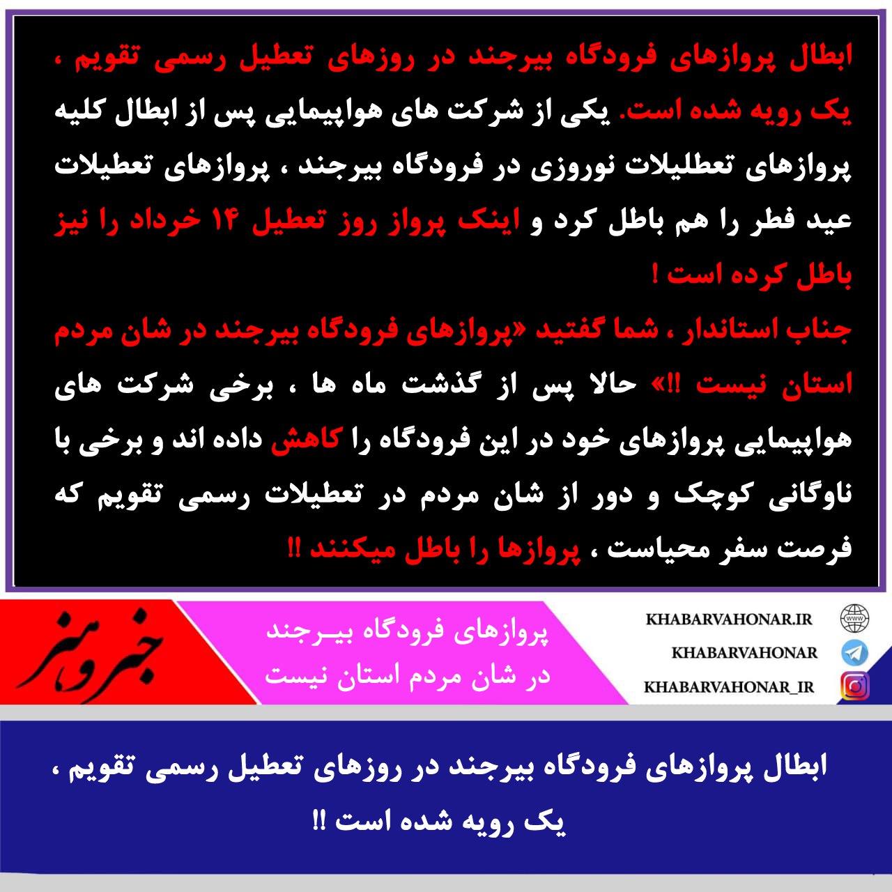جناب استاندار ، شما گفتید «پروازهای فرودگاه بیرجند در شان مردم استان نیست !!» حالا پس از گذشت ماه ها ، برخی شرکت های هواپیمایی پروازهای خود در این فرودگاه را کاهش داده اند و برخی با ناوگانی کوچک و دور از شان مردم در تعطیلات رسمی تقویم که فرصت سفر محیاست ، پروازها را باطل میکنند !!