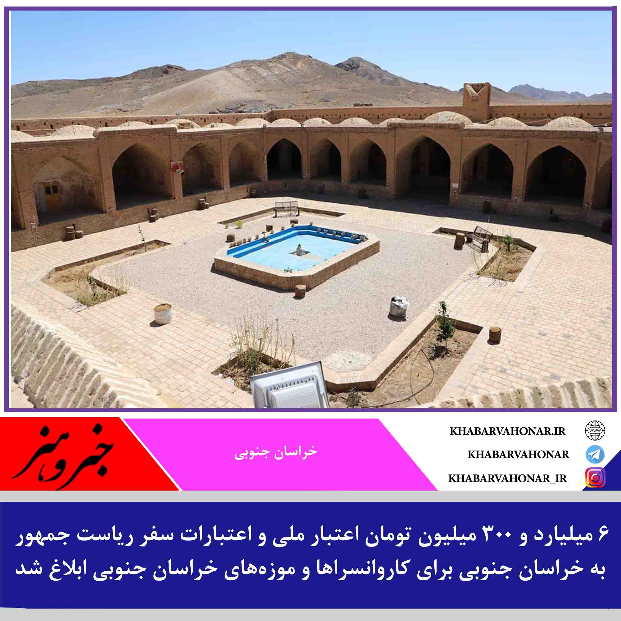 ۶ میلیارد و ۳۰۰ میلیون تومان اعتبار ملی و اعتبارات سفر ریاست جمهور به خراسان جنوبی برای کاروانسراها و موزههای خراسان جنوبی ابلاغ شد.