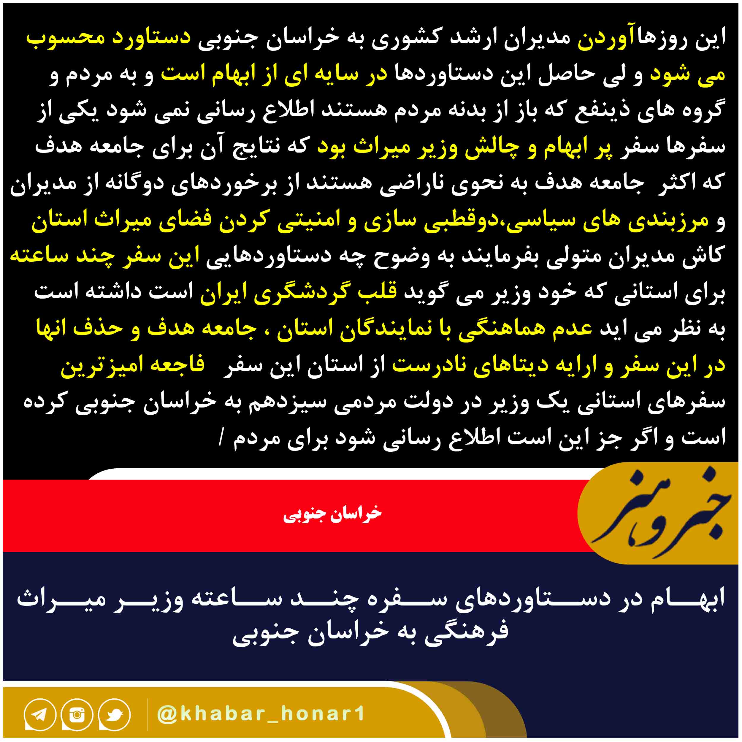 این روزهاآوردن مدیران ارشد کشوری به خراسان جنوبی دستاورد محسوب می شود و لی حاصل این دستاوردها در سایه ای از ابهام است و به مردم و گروه های ذینفع که باز از بدنه مردم هستند اطلاع رسانی نمی شود یکی از سفرها سفر پر ابهام و چالش وزیر میراث بود که نتایج آن برای جامعه هدف که اکثر جامعه هدف به نحوی ناراضی هستند از برخوردهای دوگانه از مدیران و مرزبندی های سیاسی،دوقطبی سازی و امنیتی کردن فضای میراث استان کاش مدیران متولی بفرمایند به وضوح چه دستاوردهایی این سفر چند ساعته برای استانی که خود وزیر می گوید قلب گردشگری ایران است داشته است به نظر می اید عدم هماهنگی با نمایندگان استان ، جامعه هدف و حذف انها در این سفر و ارایه دیتاهای نادرست از استان این سفر فاجعه امیزترین سفرهای استانی یک وزیر در دولت مردمی سیزدهم به خراسان جنوبی کرده است و اگر جز این است اطلاع رسانی شود برای مردم /