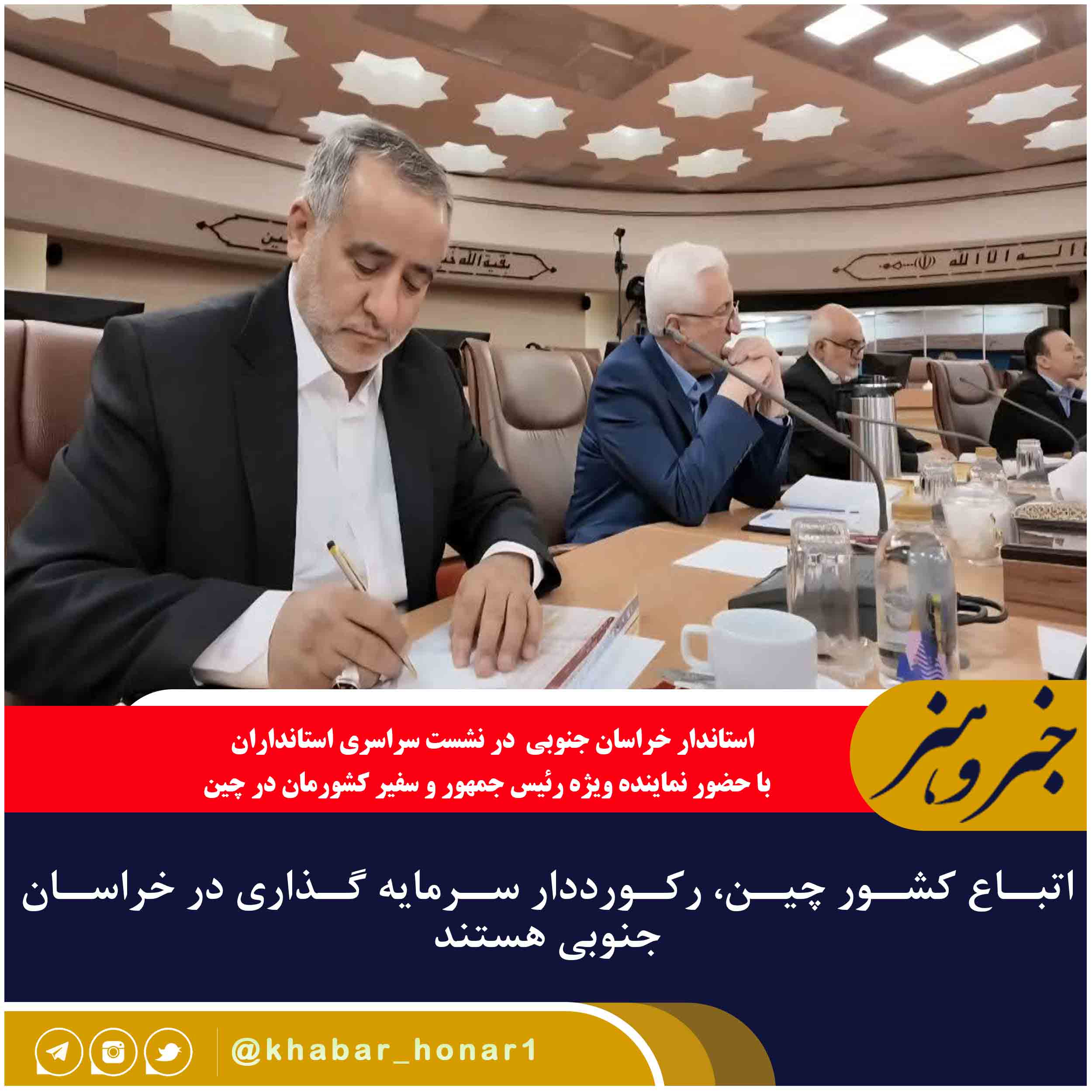 🔹سیدمحمدرضا هاشمی ا در نشست سراسری استانداران با حضور نماینده ویژه رئیس جمهور و سفیر کشورمان در چین، به تشریح ظرفیت‌های معدنی، کشاورزی، مرز، گردشگری و انرژی‌های تجدیدپذیر استان پرداخت و گفت: شرایط برای حضور و فعالیت‌ سرمایه‌گذاران داخلی و خارجی در خراسان جنوبی مهیاست.
