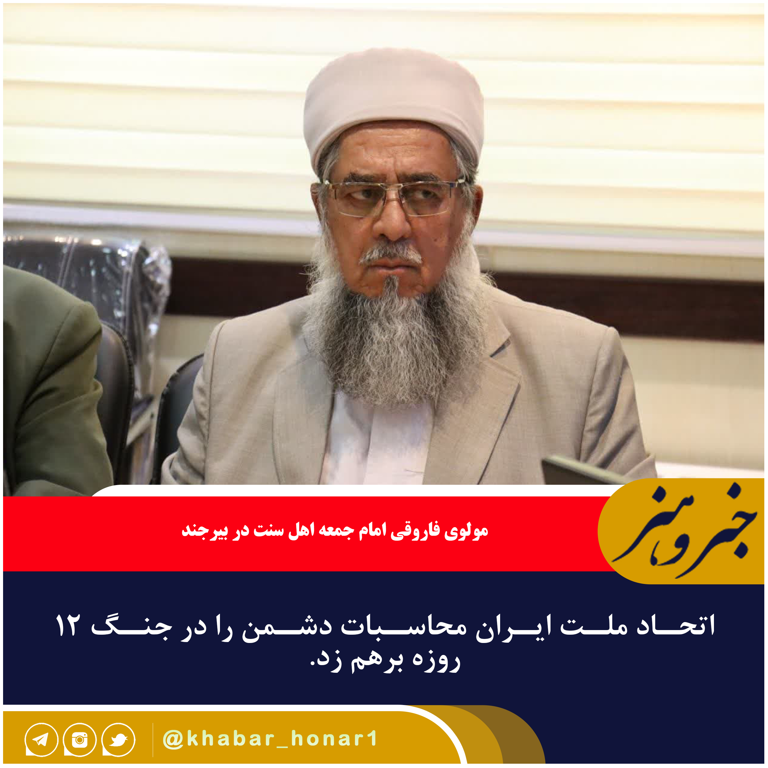 مولوی فاروقی امام جمعه اهل سنت در بیرجند در دیدار علمای اهل سنت استان با فرمانده سپاه استان ، ضمن تشکر از اقدامات سپاه و نیرو های مسلح در پاسخ کوبنده به استکبار جهانی به سردمداری اسرائیل و آمریکا گفت : اتحاد ملت ایران محاسبات دشمن را در جنگ ۱۲ روزه برهم زد و او را شکست داد و در پی این تجاوز اتحاد و وحدت مردم در دفاع از کشور بیشتر از گذشته شد.