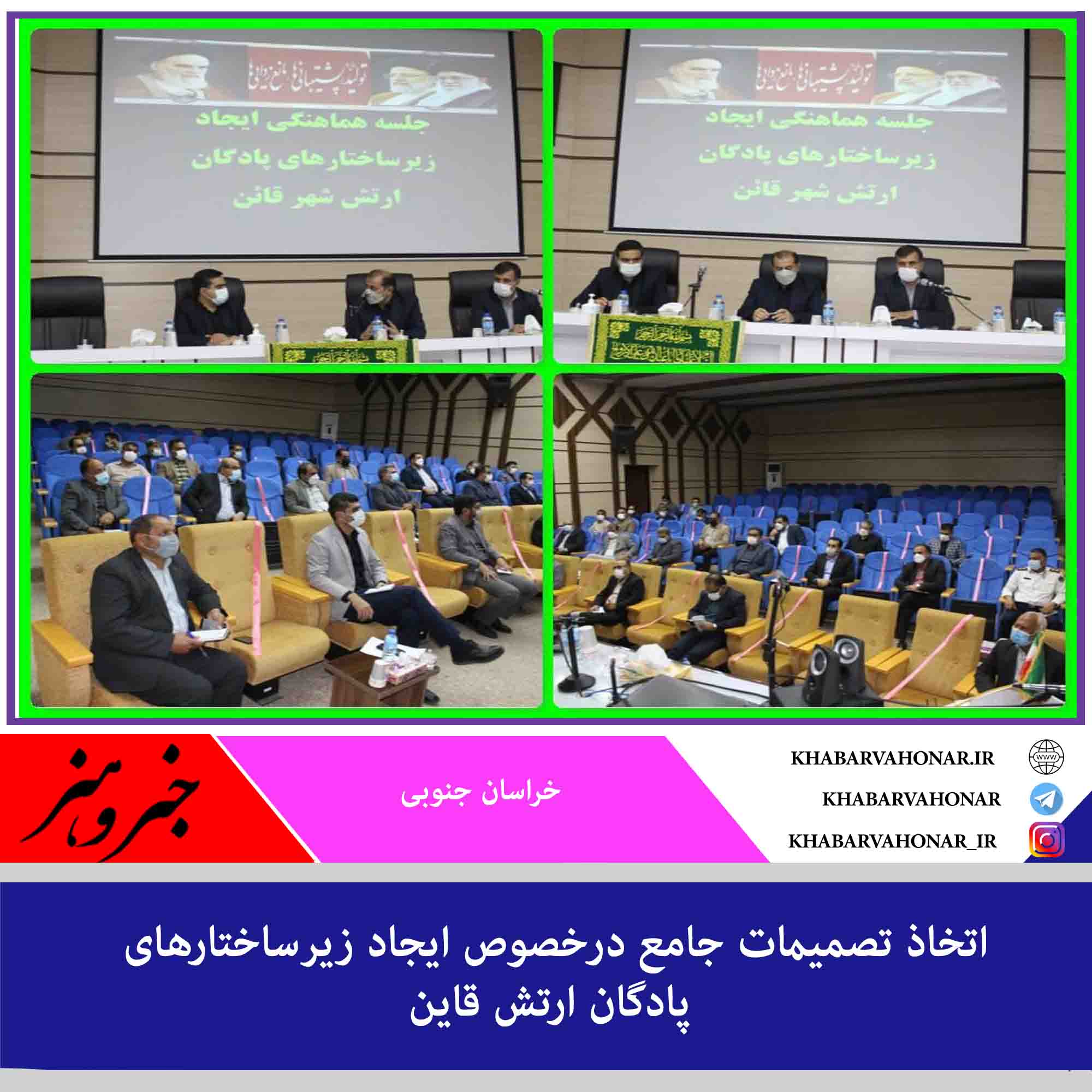 ارائه طرح تأمین منابع آبی پایدار برای پادگان و واحدهای مسکونی آن توسط شرکت آب و فاضلاب استان ظرف سه روز کاری آینده، تأمین گاز مورد نیاز پادگان به محض ارائه درخواست مسئولین پادگان و نیز تأمین گاز مورد نیاز پلیس راه قاین و مجتمع خدمات رفاهی امام رضا (ع) طی سه ماه آینده هم در شمار تصمیمات اتخاذ شده در این جلسه بود.