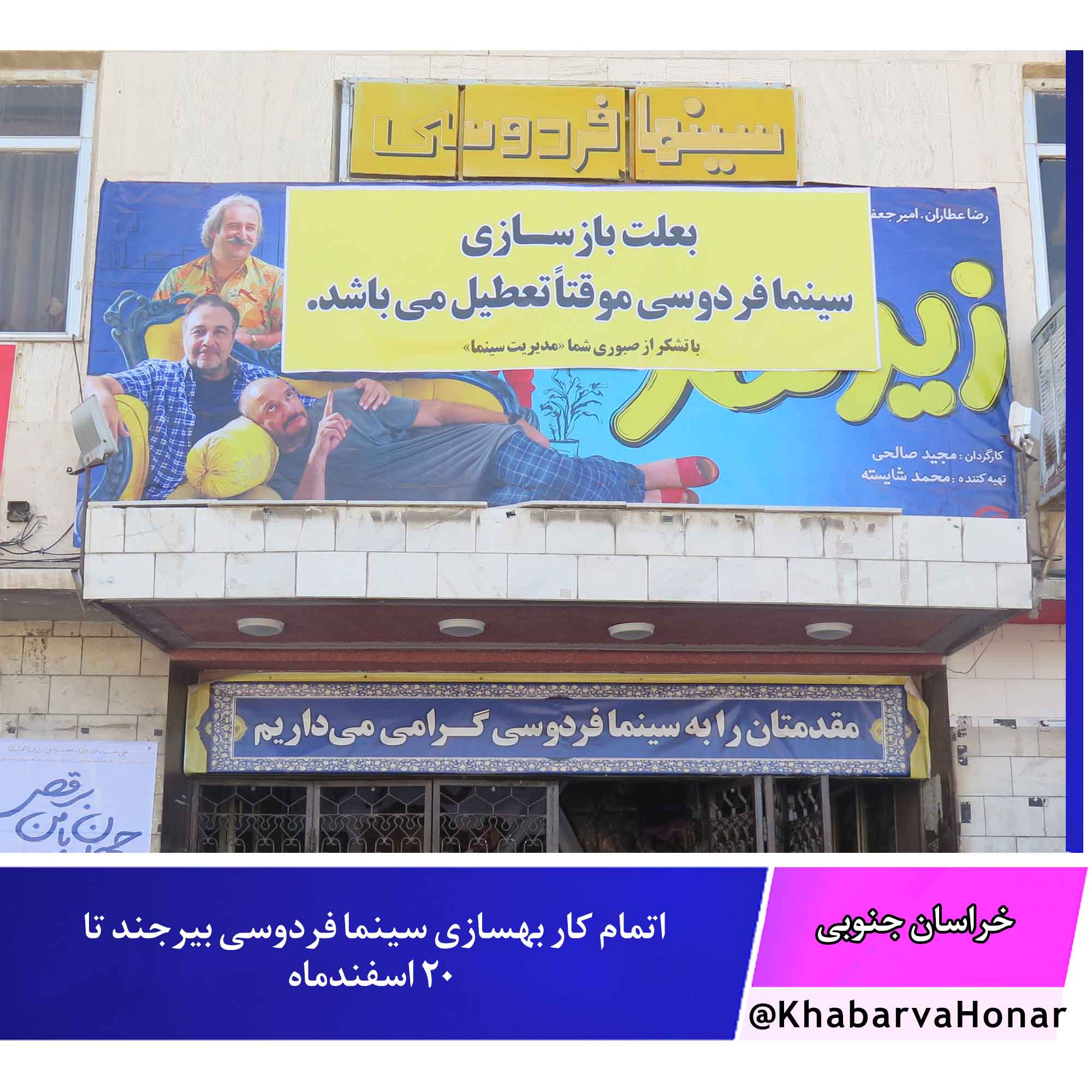 مسئول سینما فردوسی بیرجند از اتمام کار بهسازی این سینما تا ۲۰ اسفندماه ۹۸ خبر داد.
