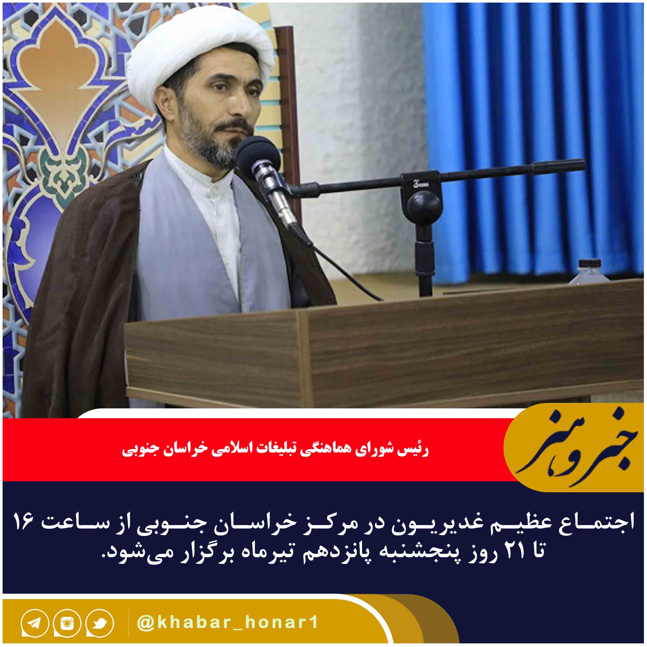 رئیس شورای هماهنگی تبلیغات اسلامی خراسان جنوبی گفت: اجتماع عظیم غدیریون در مرکز خراسان جنوبی از ساعت ۱۶ تا ۲۱ روز پنجشنبه پانزدهم تیرماه برگزار می‌شود.