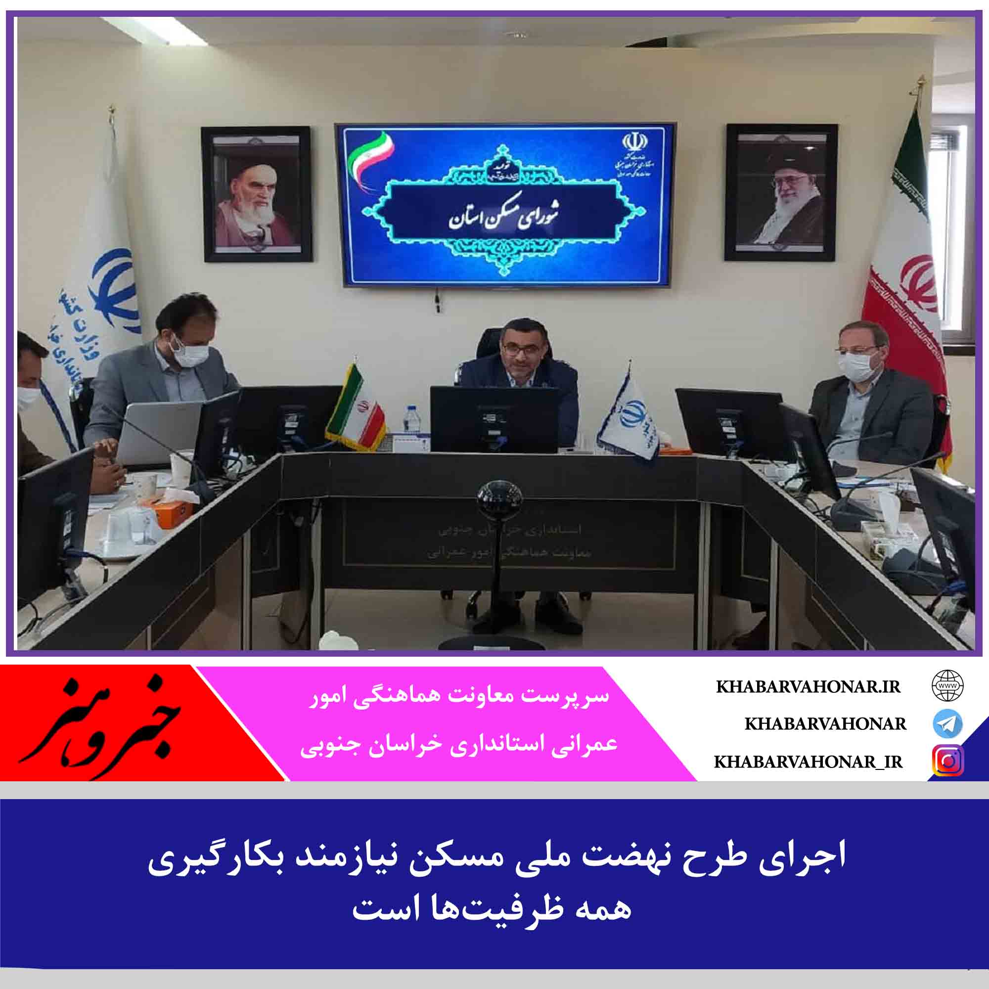 سرپرست معاونت هماهنگی امور عمرانی استانداری خراسان جنوبی گفت: دستگاههای اجرایی استان باید همه تواناییها و ظرفیتهای خود را برای اجرای طرح نهضت ملی مسکن بسیج کنند تا مسکن مناسب تحویل مردم شود.