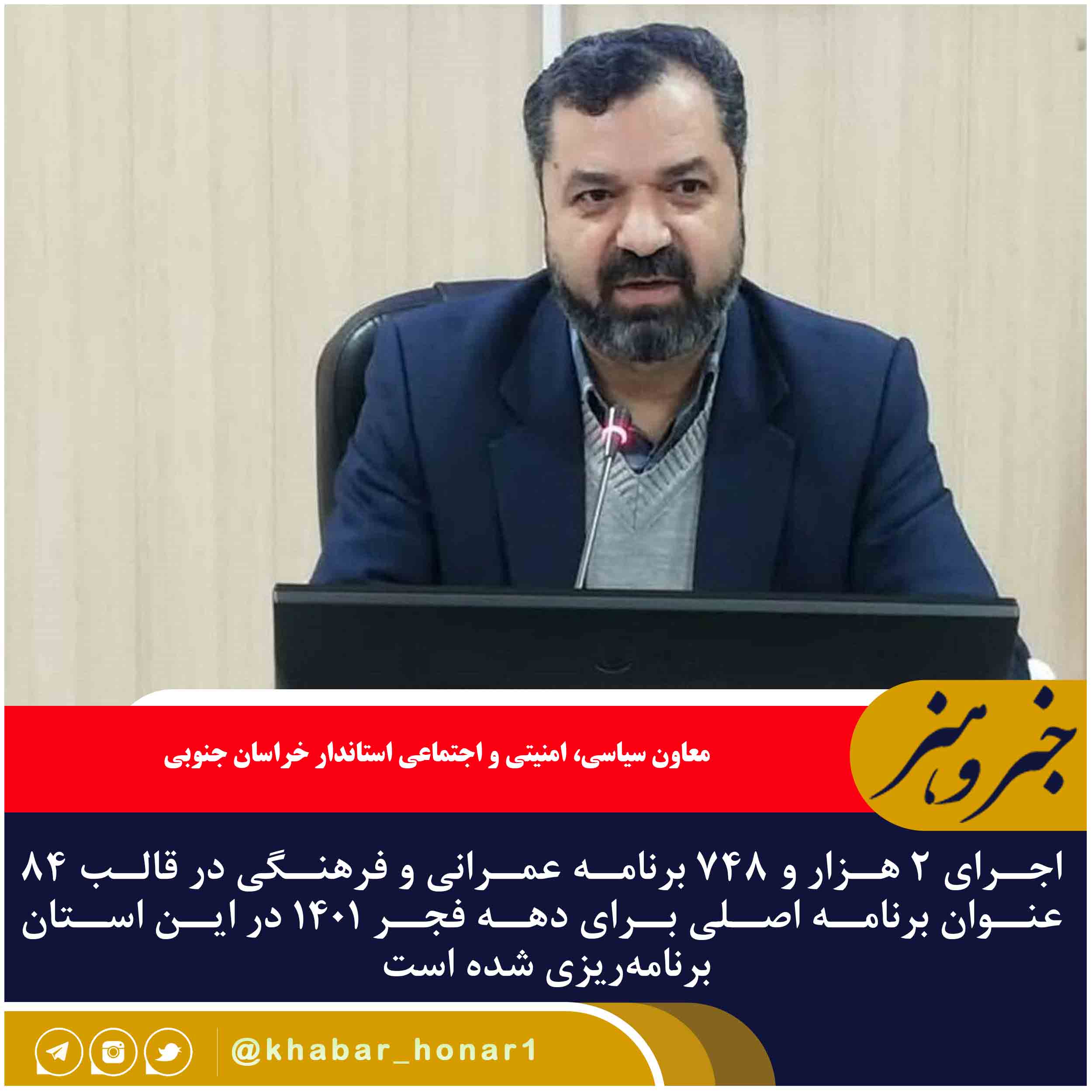 معاون سیاسی، امنیتی و اجتماعی استاندار خراسان جنوبی گفت: اجرای ۲ هزار و ۷۴۸ برنامه عمرانی و فرهنگی در قالب ۸۴ عنوان برنامه اصلی برای دهه فجر ۱۴۰۱ در این استان برنامه‌ریزی شده است.
