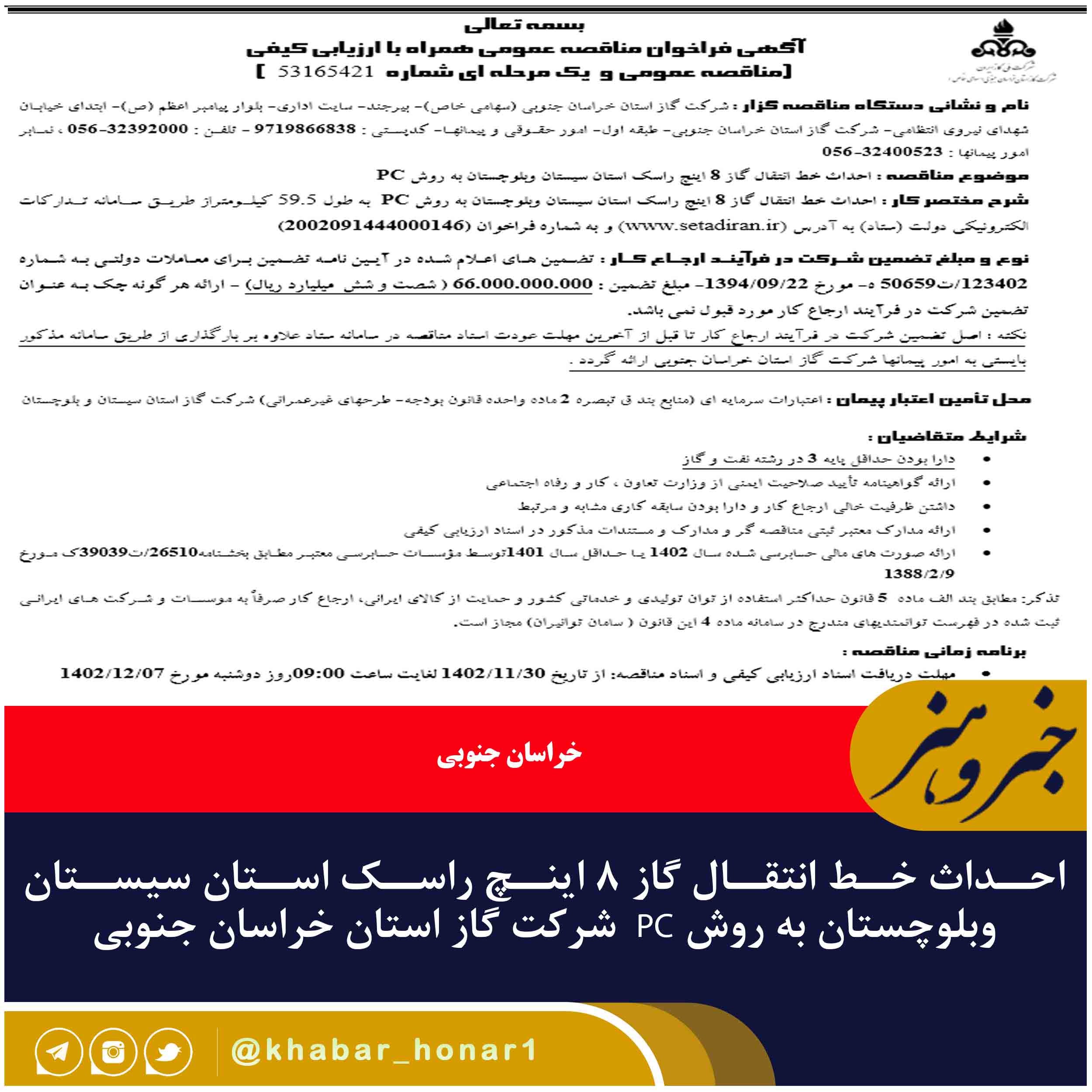 موضوع مناقصه : احداث خط انتقال گاز ۸ اینچ راسک استان سیستان وبلوچستان به روش PC