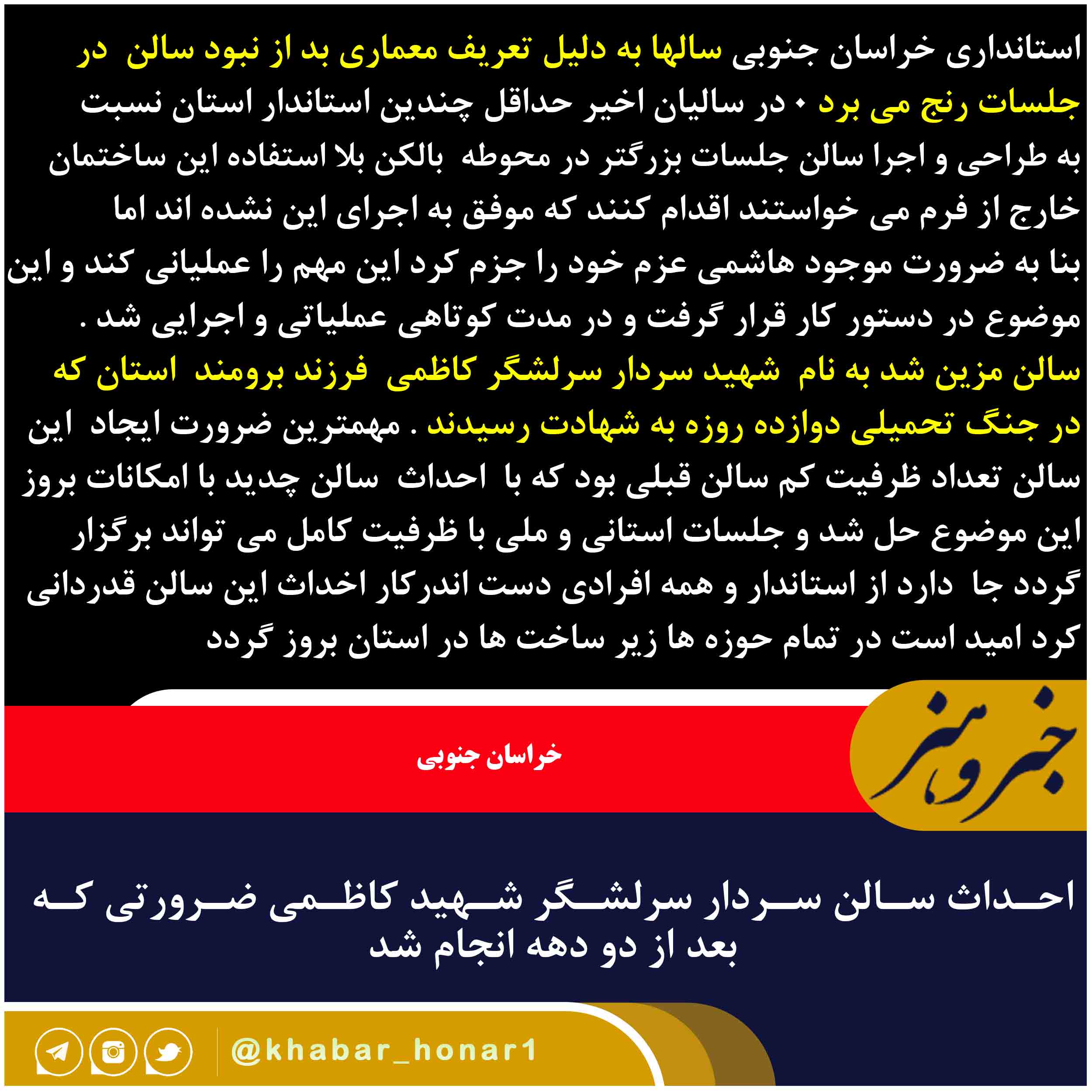 استانداری خراسان جنوبی سالها به دلیل تعریف معماری بد از نبود سالن در جلسات رنج می برد ۰ در سالیان اخیر حداقل چندین استاندار استان نسبت به طراحی و اجرا سالن جلسات بزرگتر در محوطه بالکن بلا استفاده این ساختمان خارج از فرم می خواستند اقدام کنند که موفق به اجرای این نشده اند اما بنا به ضرورت موجود هاشمی عزم خود را جزم کرد این مهم را عملیانی کند و این موضوع در دستور کار قرار گرفت و در مدت کوتاهی عملیاتی و اجرایی شد . سالن مزین شد به نام شهید سردار سرلشگر کاظمی فرزند برومند استان که در جنگ تحمیلی دوازده روزه به شهادت رسیدند . مهمترین ضرورت ایجاد این سالن تعداد ظرفیت کم سالن قبلی بود که با احداث سالن چدید با امکانات بروز این موضوع حل شد و جلسات استانی و ملی با ظرفیت کامل می تواند برگزار گردد جا دارد از استاندار و همه افرادی دست اندرکار اخداث این سالن قدردانی کرد امید است در تمام حوزه ها زیر ساخت ها در استان بروز گردد