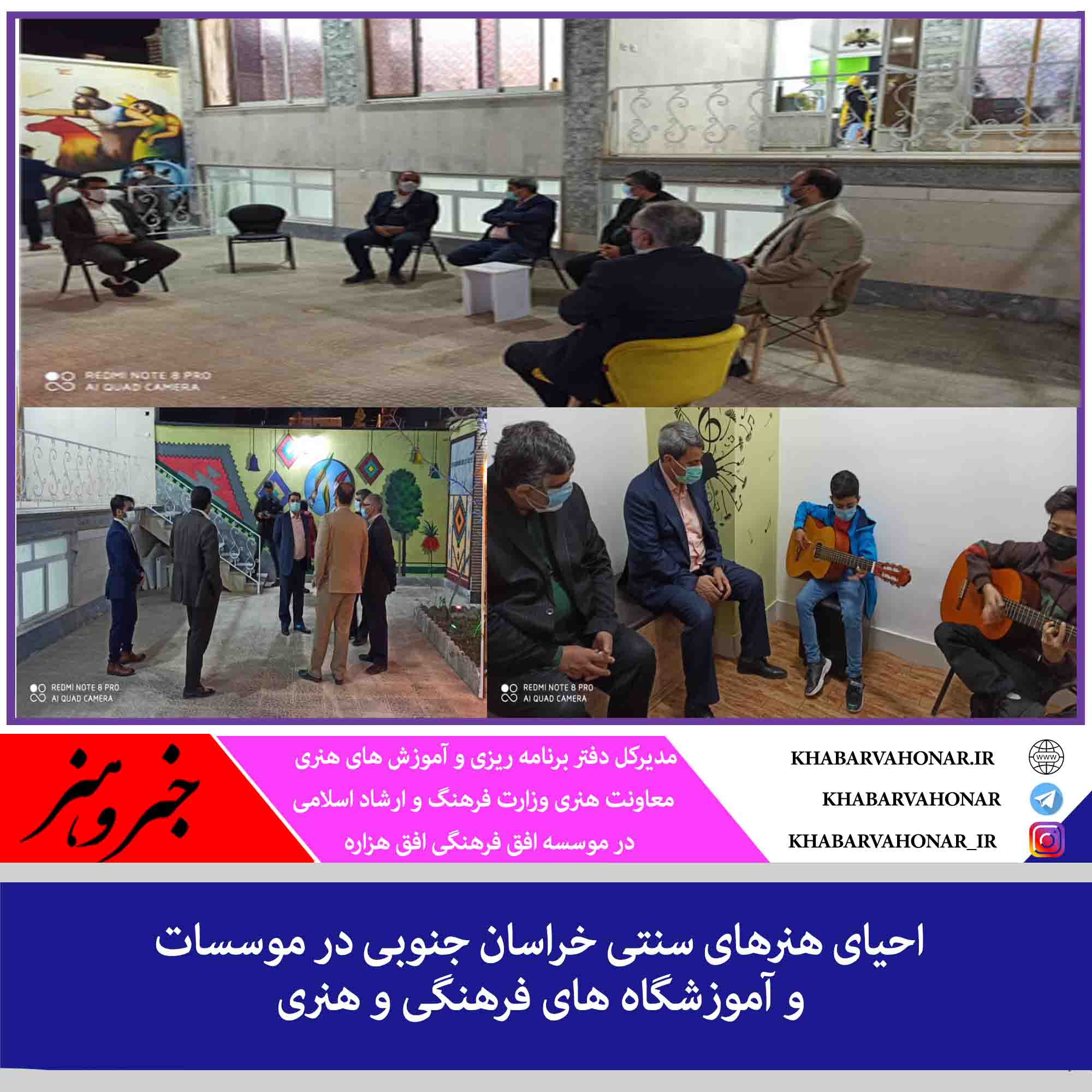 مدیرکل دفتر برنامه ریزی و آموزش های هنری معاونت هنری وزارت فرهنگ و ارشاد اسلامی گفت: بستر احیای هنرهای سنتی و حفظ داشته های این سرزمین در موسسات و آموزشگاه های فرهنگی و هنری استان فرآهم شود.مدیرکل دفتر برنامه ریزی و آموزش های هنری معاونت هنری وزارت فرهنگ و ارشاد اسلامی شامگاه چهارشنبه همراه با مدیر کل فرهنگ و ارشاد اسلامی خراسان جنوبی از موسسه فرهنگی و هنری افق هزاره و آموزشگاه موسیقی چکاوک در بیرجند بازدید کرد.