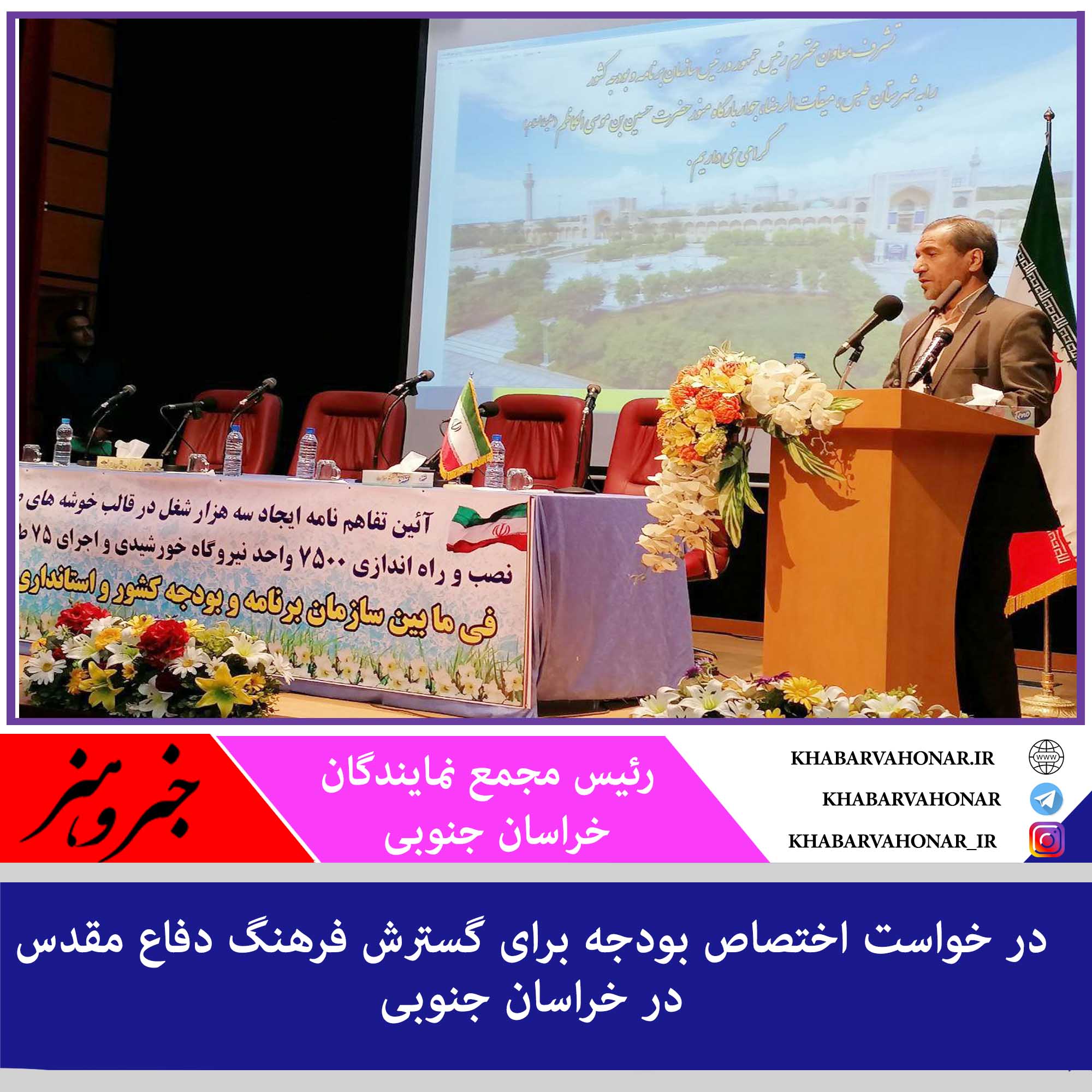 ?خسروی رئیس مجمع نمایندگان خراسان جنوبی با اشاره به اهمیت ترویج فرهنگ دفاع مقدس، خواستار بودجه ویژه برای موزه دفاع مقدس در خراسان جنوبی شد.