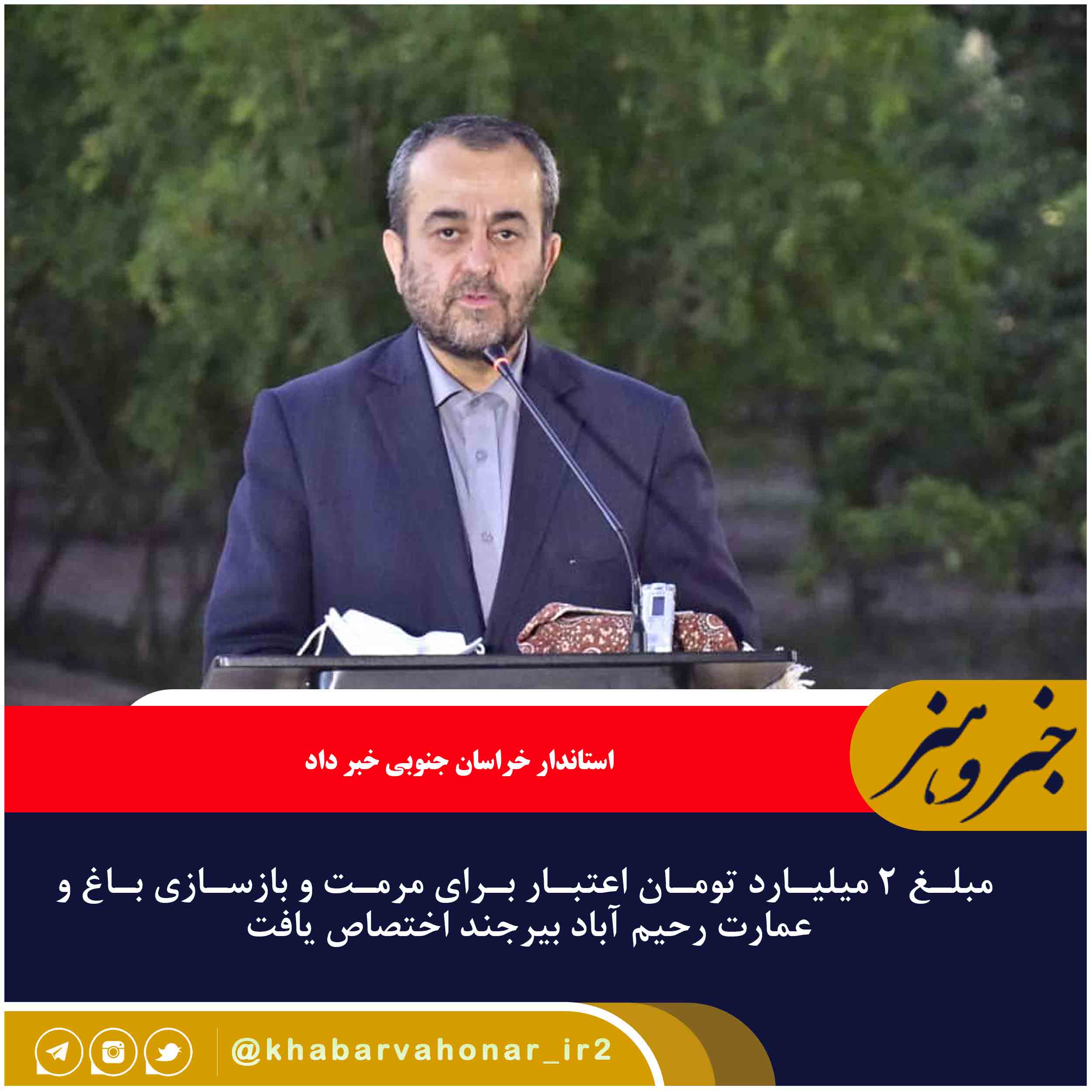 ?استاندار خراسان جنوبی گفت: مبلغ ۲ میلیارد تومان اعتبار برای مرمت و بازسازی باغ و عمارت رحیم آباد بیرجند اختصاص یافت.