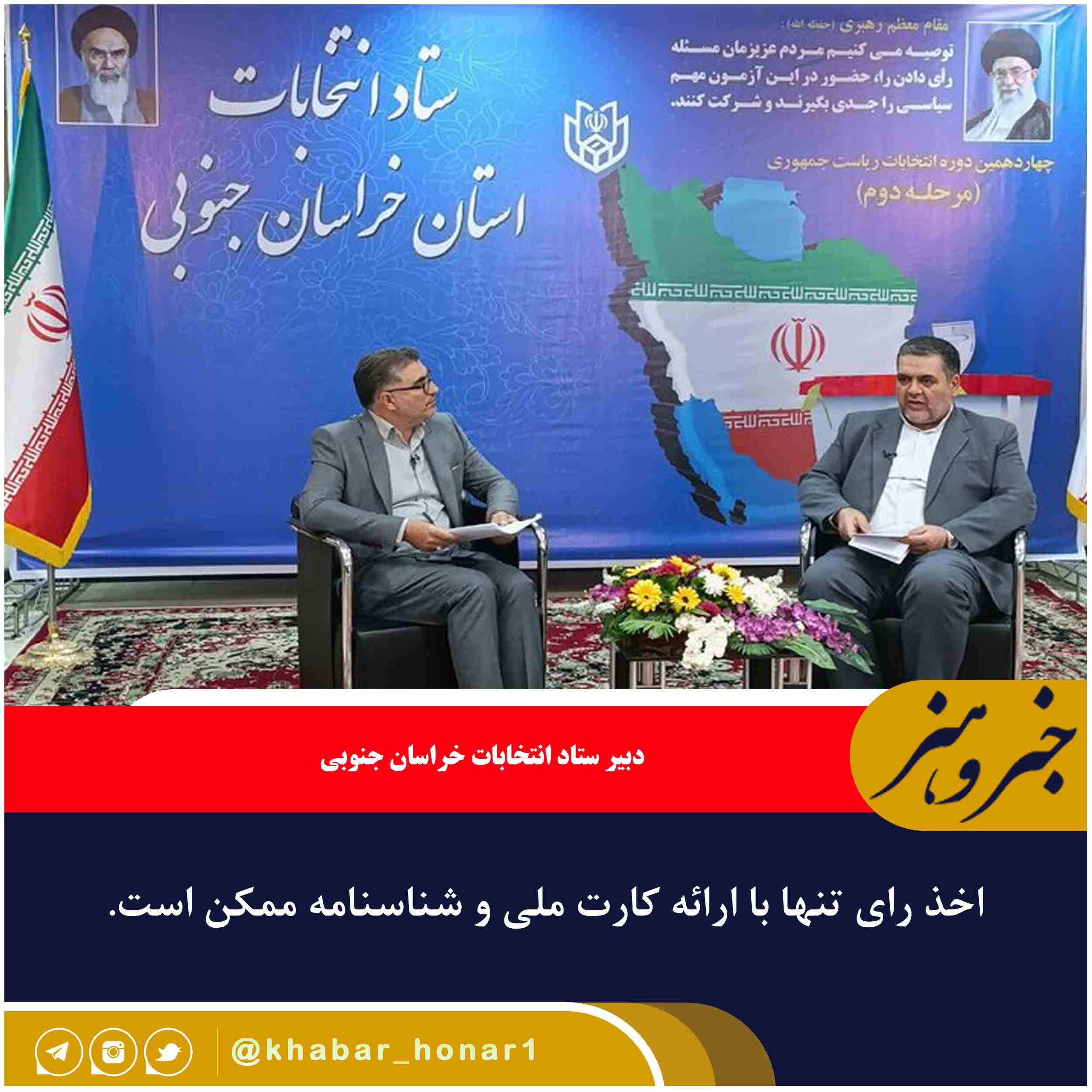 دبیر ستاد انتخابات خراسان جنوبی در ستاد انتخابات استان چند نکته مهم انتخاباتی را مطرح کرد و گفت: اخذ رای تنها با ارائه کارت ملی و شناسنامه ممکن است.