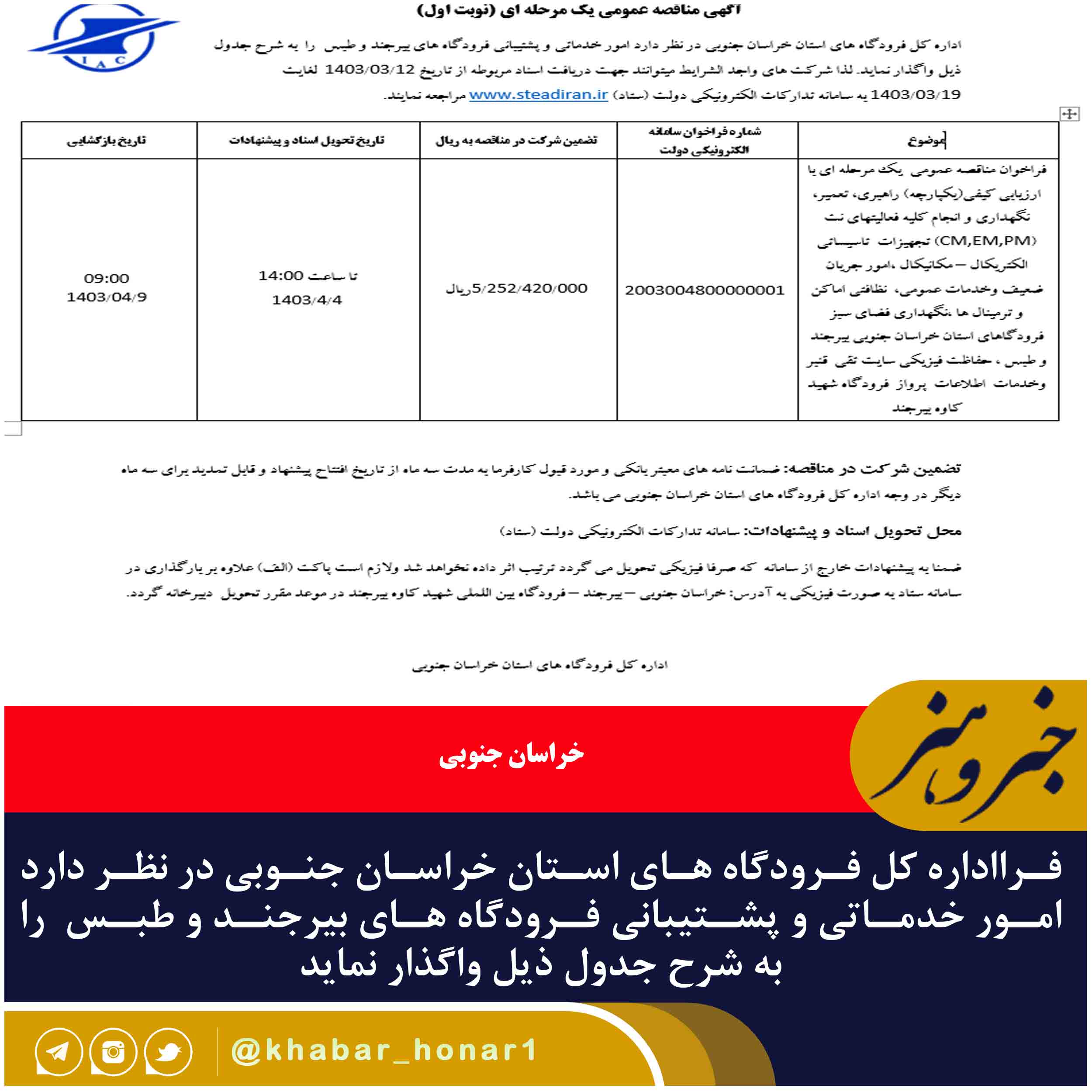 اداره کل فرودگاه های استان خراسان جنوبی در نظر دارد امور خدماتی و پشتیبانی فرودگاه های بیرجند و طبس را به شرح جدول ذیل واگذار نماید. لذا شرکت های واجد الشرایط میتوانند جهت دریافت اسناد مربوطه از تاریخ ۱۲/۰۳/۱۴۰۳ لغایت ۱۹/۰۳/۱۴۰۳ به سامانه تدارکات الکترونیکی دولت (ستاد) www.steadiran.ir مراجعه نمایند.