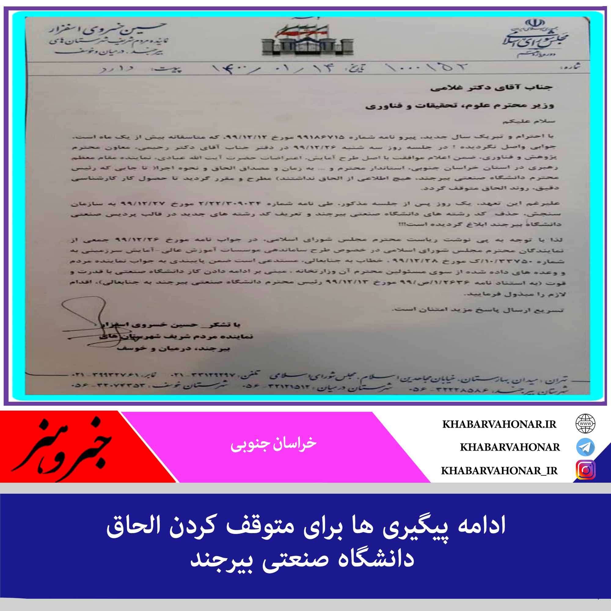 ?نماینده مردم شهرستان های بیرجند، درمیان و خوسف در مجلس شورای در نامه ای به وزیر علوم ، تحقیقات و فناوری خواستار توقف الحاق دانشگاه صنعتی به دانشگاه بیرجند شد.