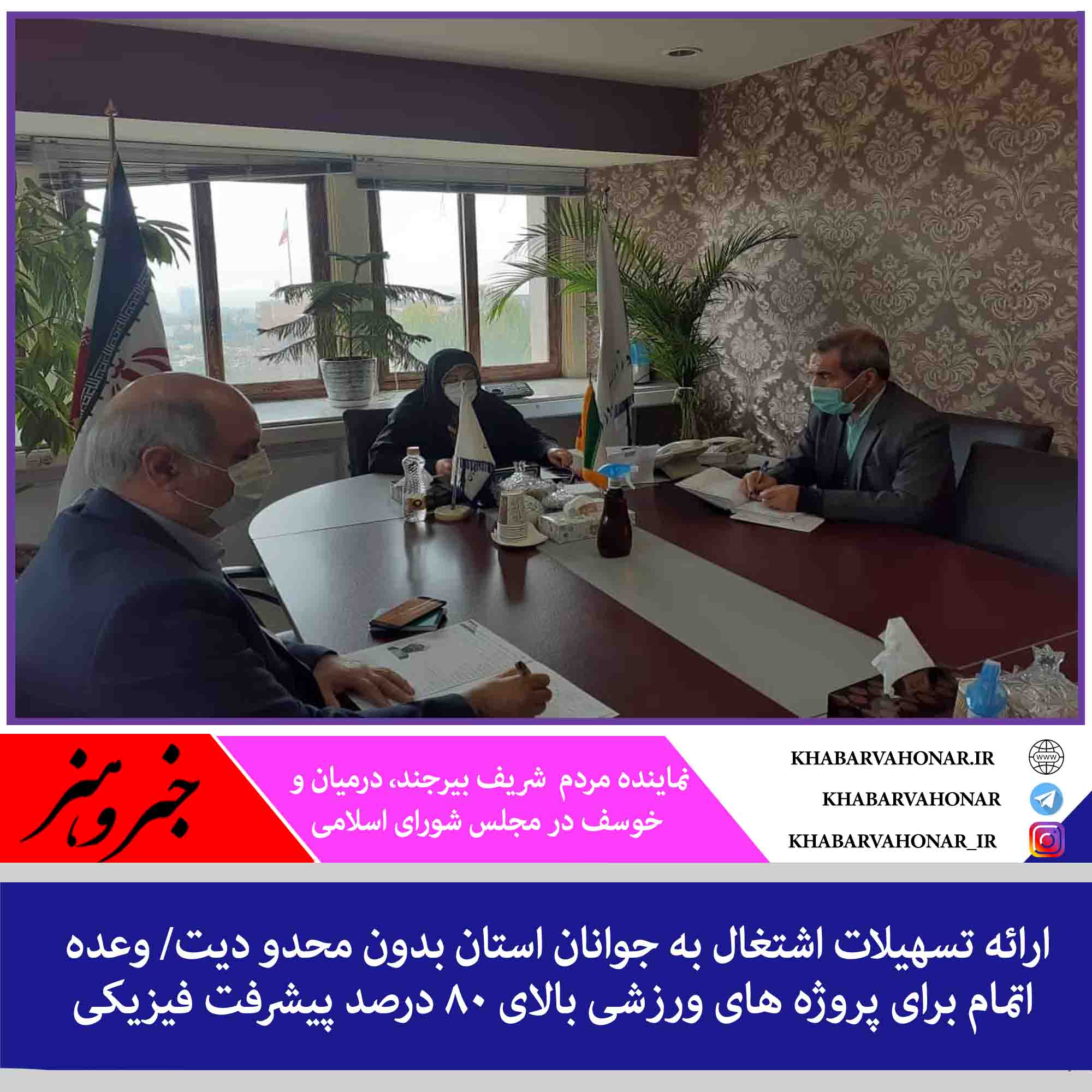 نماینده مردم بیرجند، درمیان و خوسف در مجلس شورای اسلامی به همراه مدیر کل ورزش و جوانان خراسان جنوبی شب گذشته با تقی زاده معاون امور مجلس و خانم فرامرزیان معاون توسعه و مدیریت منابع وزارت ورزش و جوانان دیدار و گفتگو کرد. خسروی با اعلام این خبر گفت: در این دیدار مطالب و درخواست های متعدد مردم حوزه انتخابیه مطرح و مصوباتی هم داشت : مثلا میزان اعتبار و تسهیلات در نظر گرفته شده برای اشتغال جوانان در اداره کل ورزش و جوانان استان، قبلا ۴ میلیارد تومان بوده است که در این دیدار مصوب شد این تسهیلات بدون سقف ریالی ، حسب مقررات ،توسط اداره کل ورزش و جوانان استان ارائه شود .