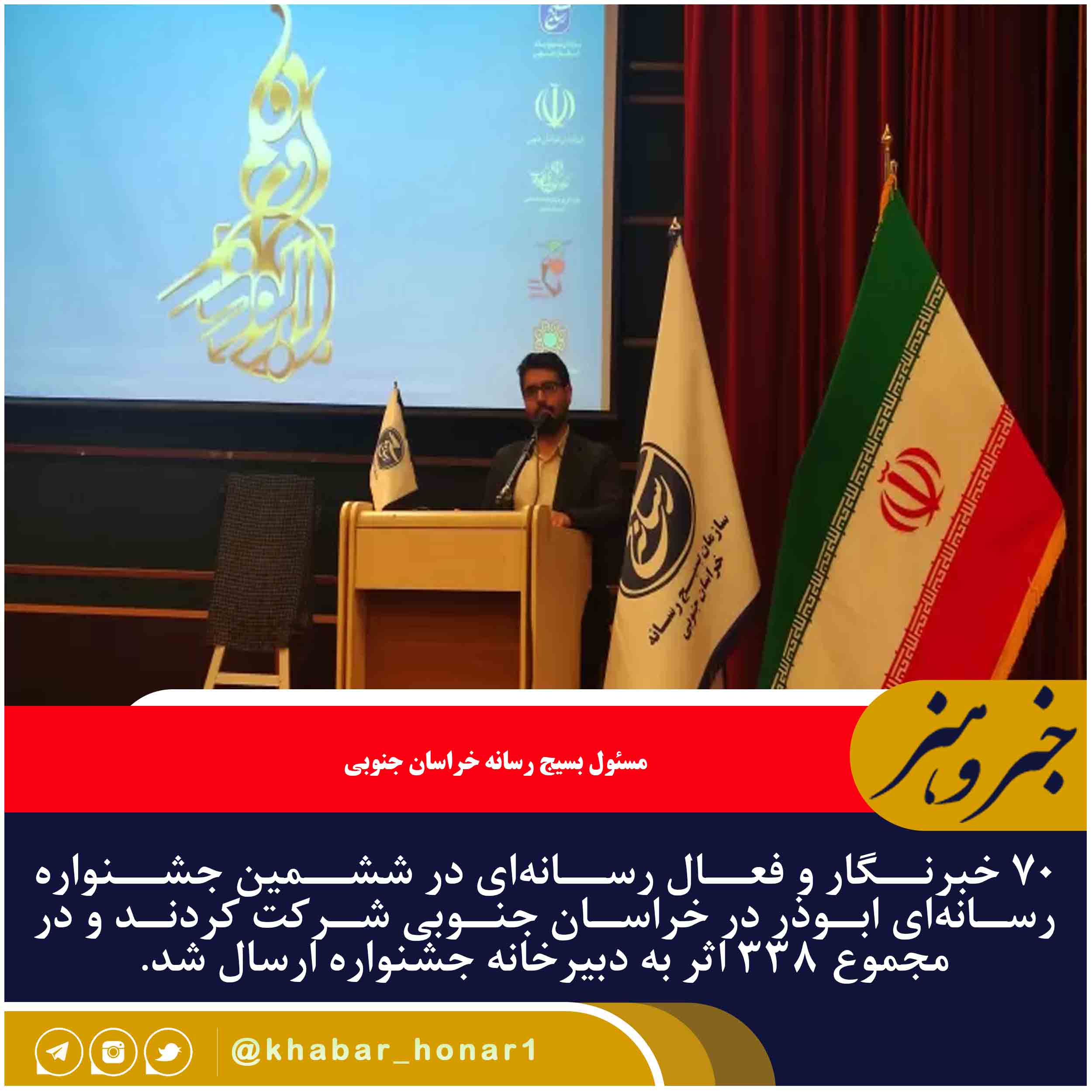مسئول بسیج رسانه خراسان جنوبی گفت: ۷۰ خبرنگار و فعال رسانهای در ششمین جشنواره رسانهای ابوذر در خراسان جنوبی شرکت کردند و در مجموع ۳۳۸ اثر به دبیرخانه جشنواره ارسال شد.