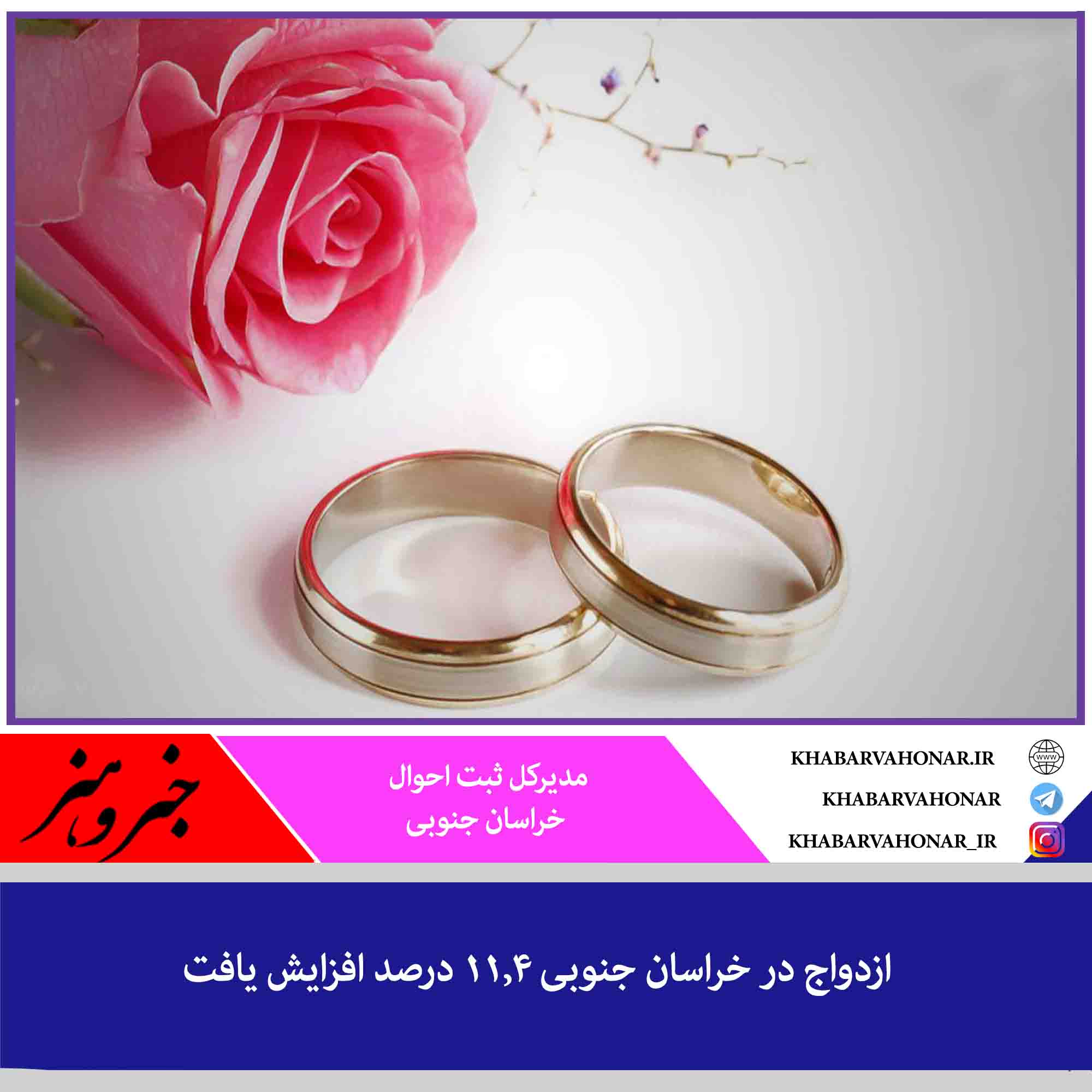مدیرکل ثبت احوال خراسان جنوبی گفت: میزان ثبت ازدواج در این استان از ابتدای امسال تا پایان مهر ماه نسبت به مدت مشابه سال قبل ۱۱.۴ درصد افزایش داشته است.