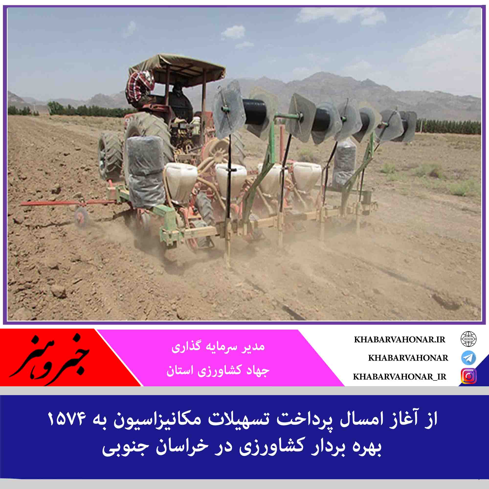 تسهیلات خط اعتباری مکانیزاسیون کشاورزی امسال به هزار و ۵۷۴بهره بردار این بخش در خراسان جنوبی پرداخت شد.