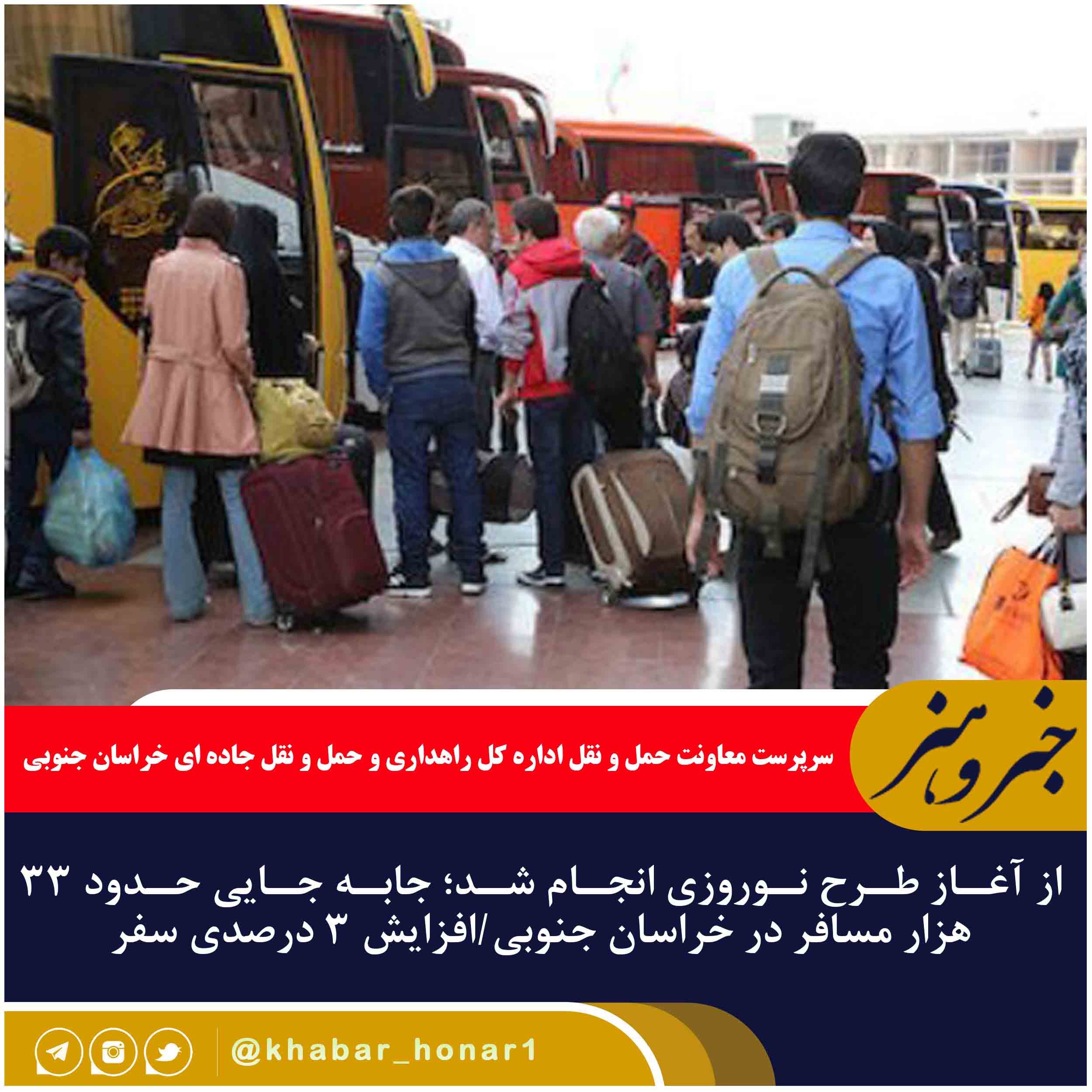 سرپرست معاونت حمل و نقل اداره کل راهداری و حمل و نقل جاده ای خراسان جنوبی از جابه جایی ۳۲ هزار و ۳۹۲ مسافر از ابتدای شروع طرح نوروزی تا یک فروردین در استان خبر داد.