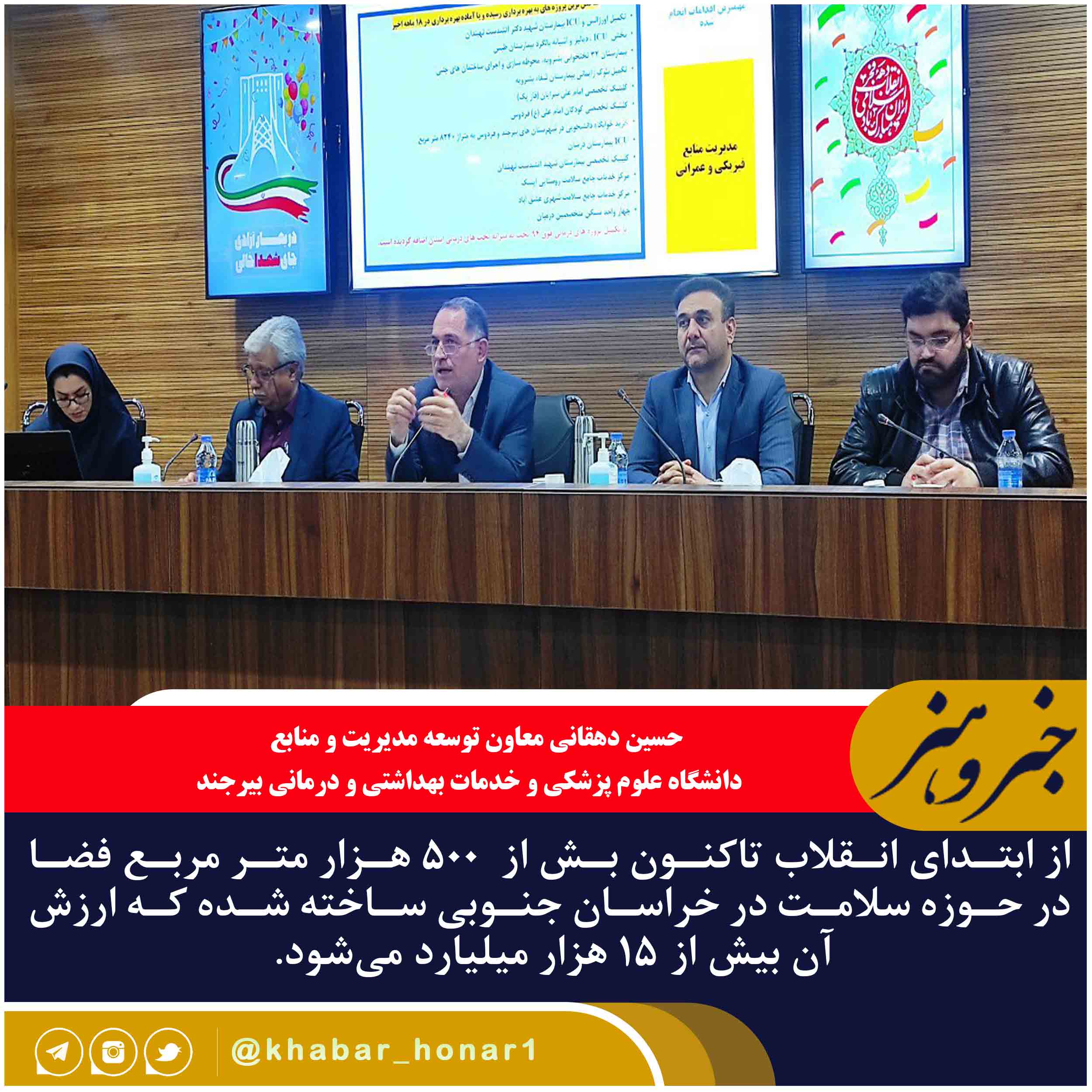 حسین دهقانی معاون توسعه مدیریت و منابع دانشگاه علوم پزشکی و خدمات بهداشتی و درمانی بیرجند بعد از ظهر امروز در نشست خبری به مناسبت دهه فجر، اظهار کرد: از ابتدای انقلاب تاکنون بش از ۵۰۰ هزار متر مربع فضا در حوزه سلامت در خراسان جنوبی ساخته شده که ارزش آن بیش از ۱۵ هزار میلیارد میشود.
