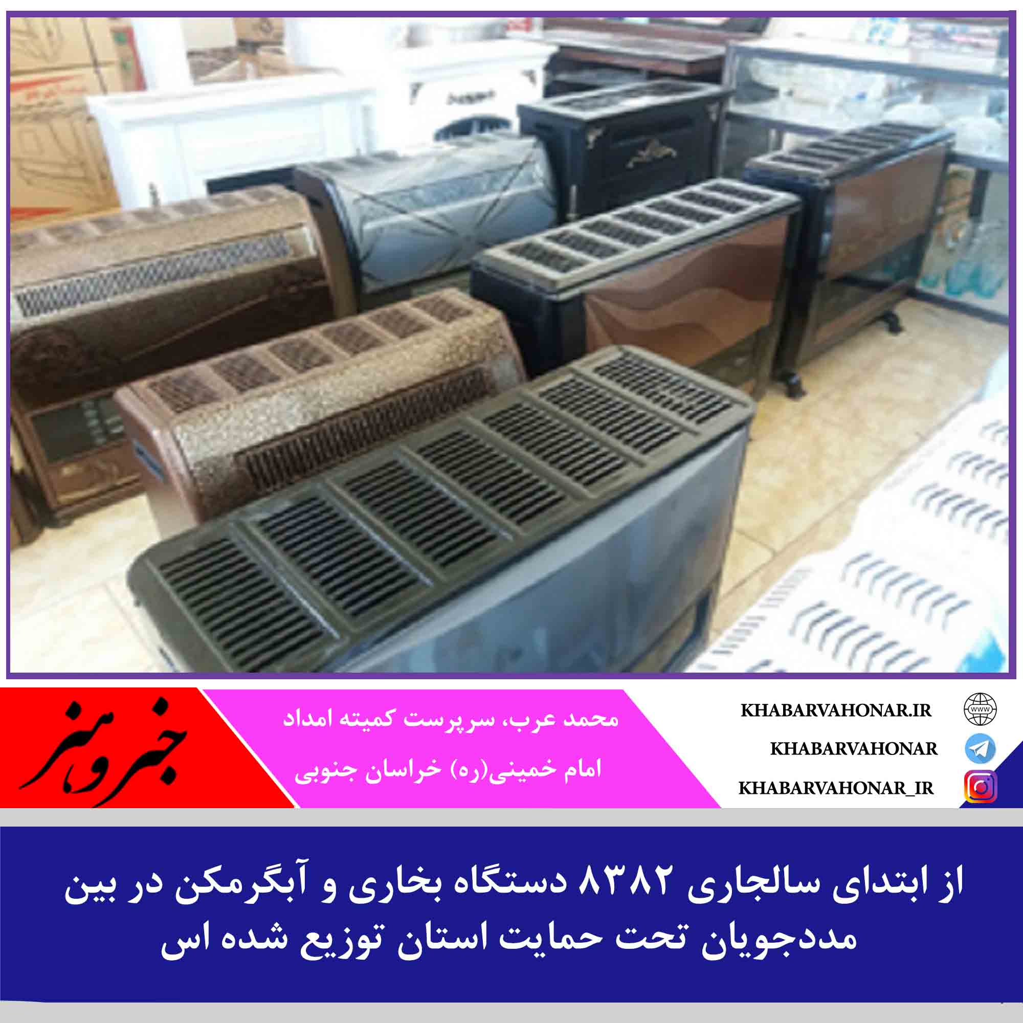 محمد عرب، سرپرست کمیته امداد امام خمینی(ره) خراسان جنوبی گفت: از ابتدای سالجاری ۸۳۸۲ دستگاه بخاری و آبگرمکن در بین مددجویان تحت حمایت استان توزیع شده است.