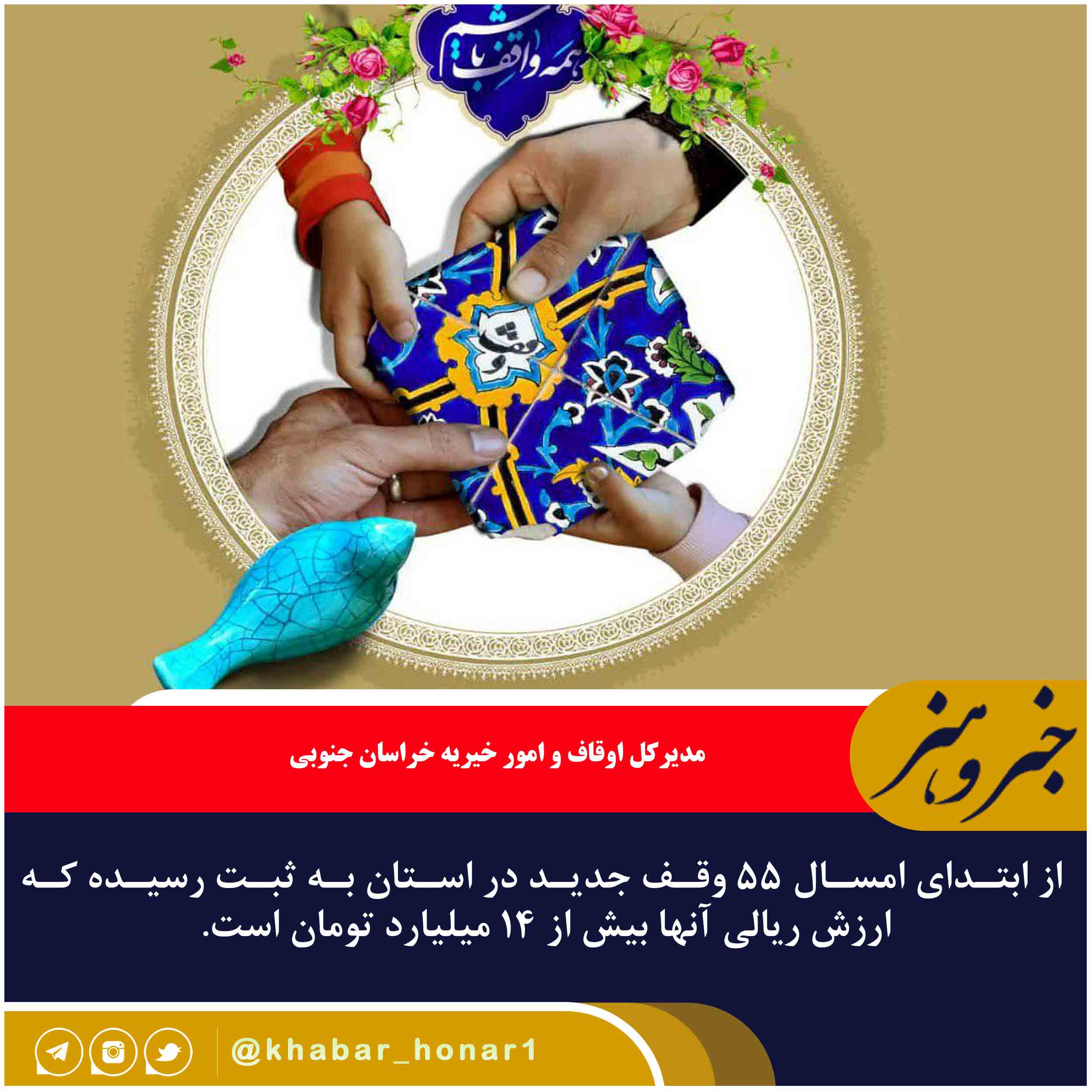 مدیرکل اوقاف و امور خیریه خراسان جنوبی گفت: از ابتدای امسال ۵۵ وقف جدید در استان به ثبت رسیده که ارزش ریالی آنها بیش از ۱۴ میلیارد تومان است.