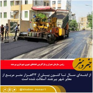 رئیس سازمان عمران و بازآفرینی فضاهای شهری شهرداری بیرجند گفت: از ابتدای سال تا کنون بیش از ۳۳هزار متر مربع از معابر شهر بیرجند آسفالت شده است.