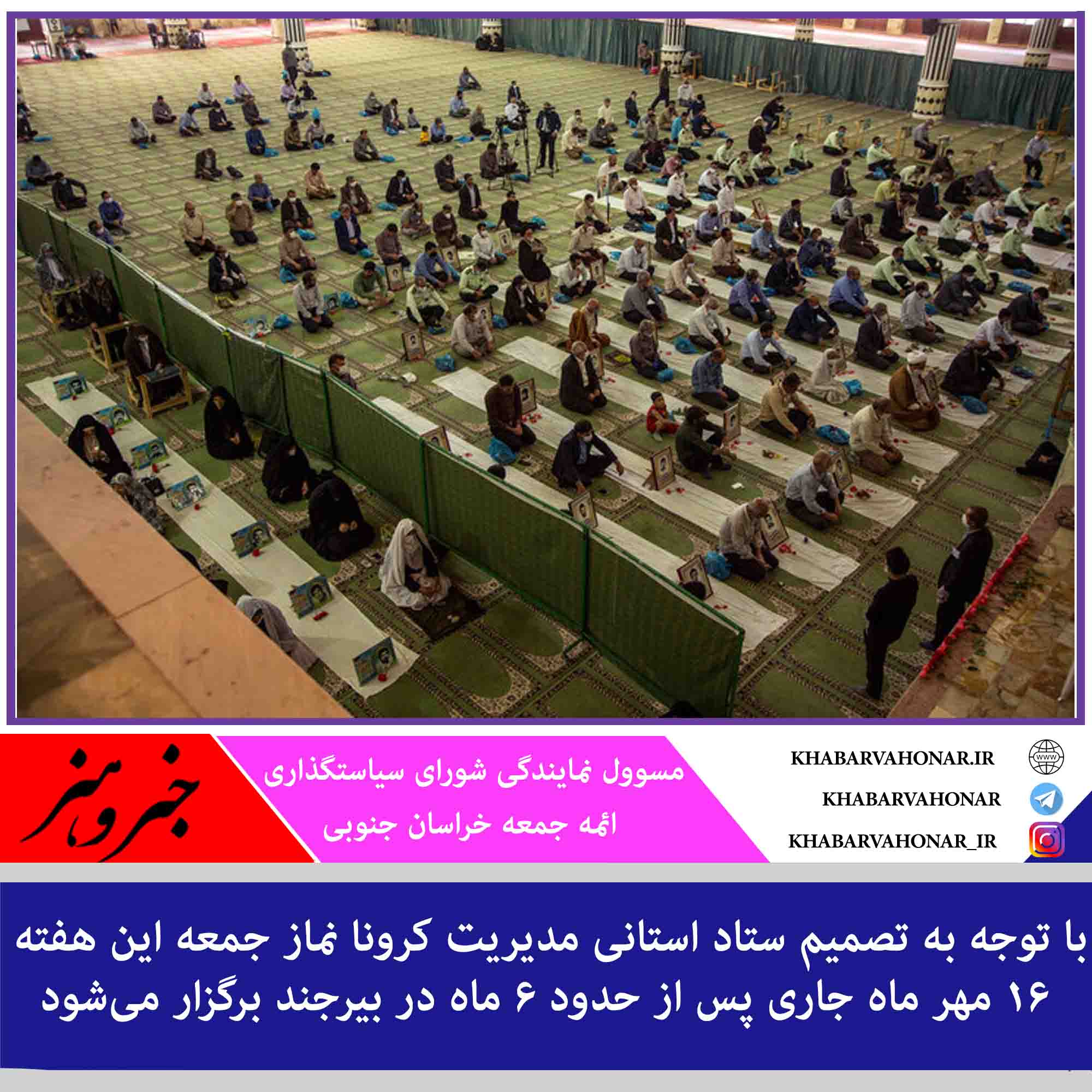 مسوول نمایندگی شورای سیاستگذاری ائمه جمعه خراسان جنوبی گفت: با توجه به تصمیم ستاد استانی مدیریت کرونا نماز جمعه این هفته ۱۶ مهر ماه جاری پس از حدود ۶ ماه در بیرجند برگزار میشود.