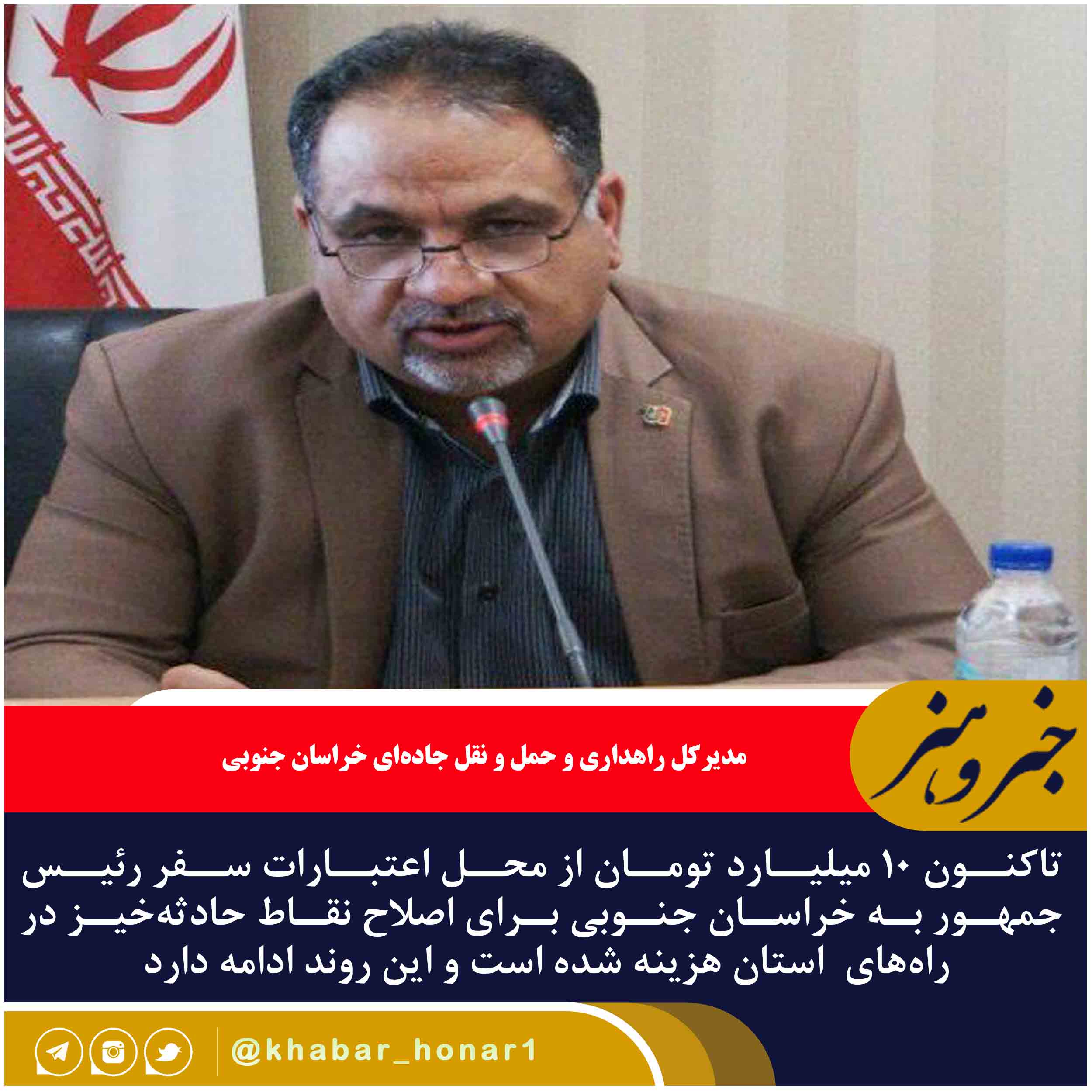 مدیرکل راهداری و حمل و نقل جادهای خراسان جنوبی گفت: تاکنون ۱۰ میلیارد تومان از محل اعتبارات سفر رئیس جمهور به خراسان جنوبی برای اصلاح نقاط حادثهخیز در راههای این استان هزینه شده است و این روند ادامه دارد.