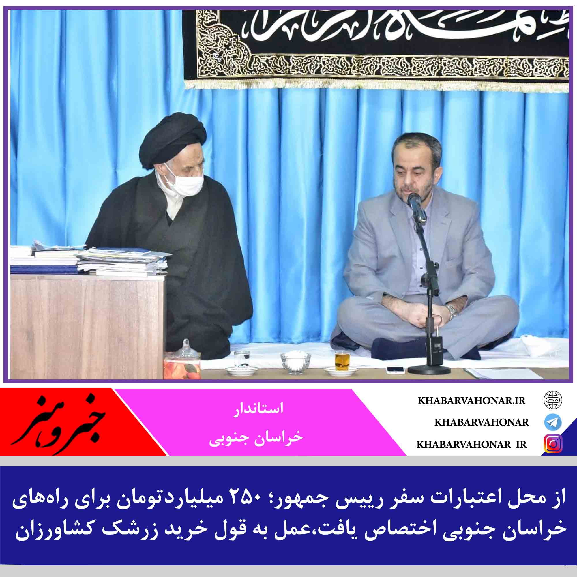 پیگیری مصوبات سومین سفر استانی رییس جمهور را از اقدامات انجام شده در هفتههای اخیر برشمرد و گفت: اعتبارات خوبی از محل سفر رییس جمهور به خراسان جنوبی اختصاص یافت که فقط برای مرمت و بهسازی راههای استان حداقل ۲۵۰ میلیارد تومان اعتبار را اخذ کردهایم.