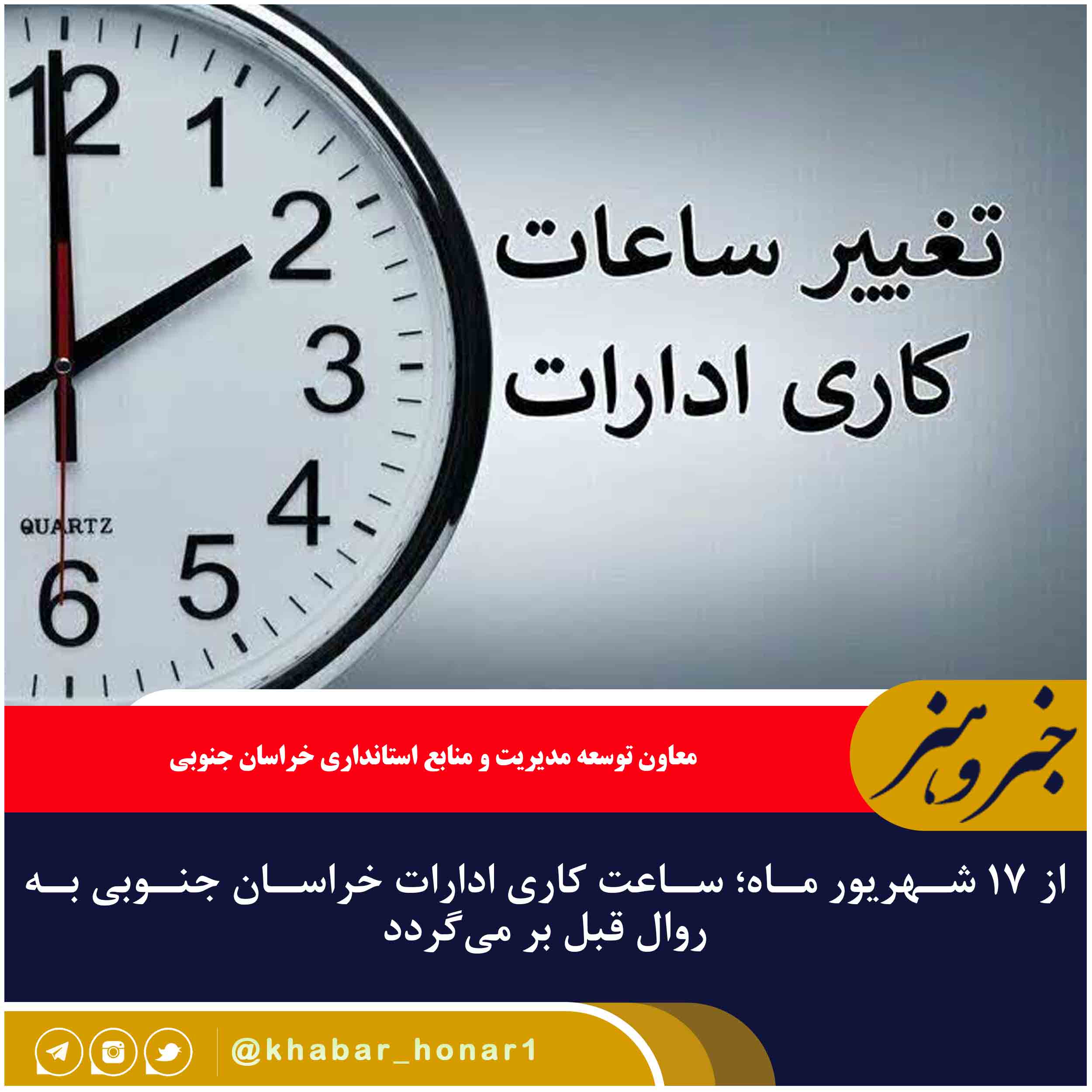وی اظهار داشت: ساعات کار تمامی ادارات خراسان جنوبی از شنبه ۱۷ شهریور از هفت و نیم تا ۱۴:۳۰ خواهد بود.