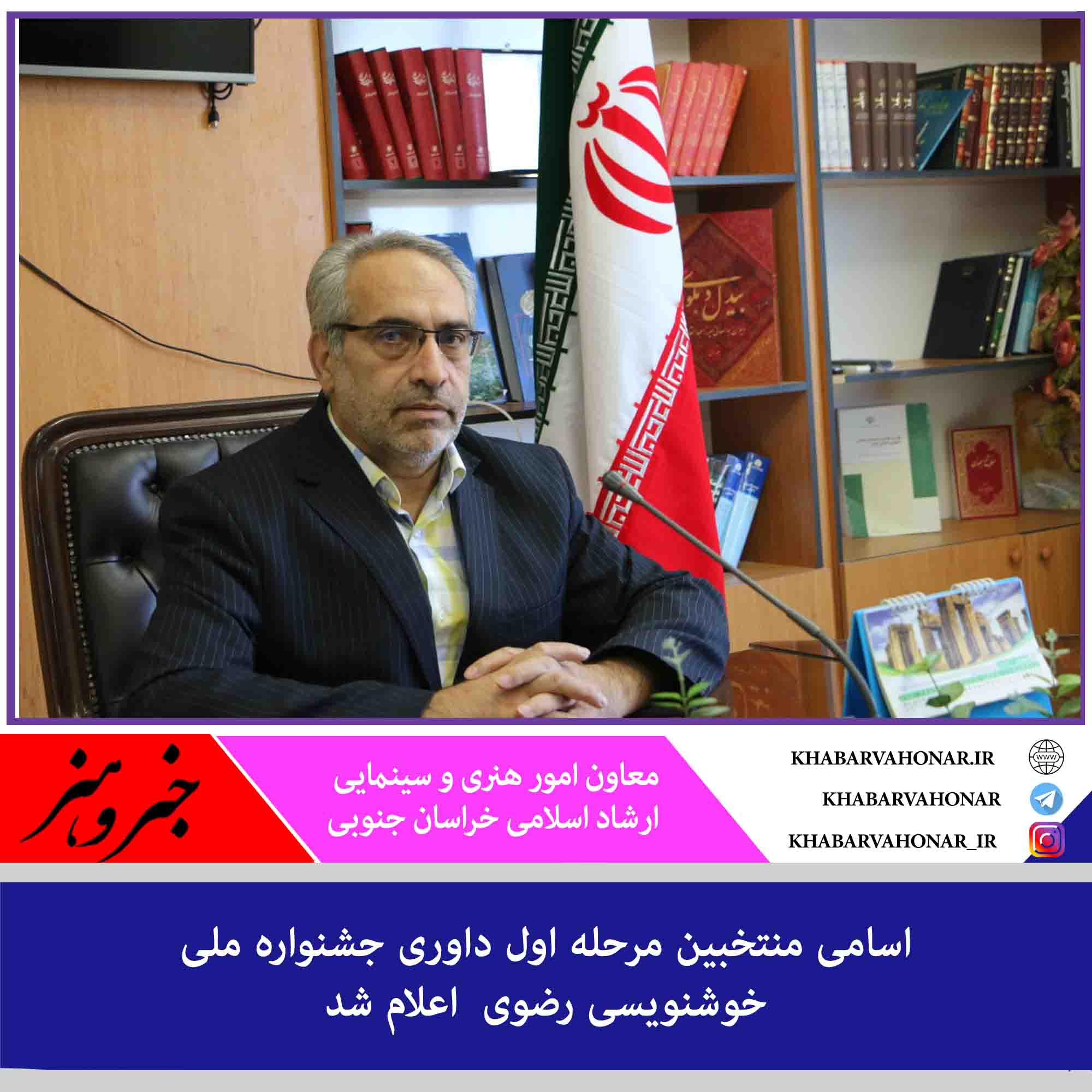 معاون امور هنری و سینمایی اداره کل فرهنگ و ارشاد اسلامی خراسان جنوبی از اعلام اسامی منتخبین مرحله اول داوری هفدهمین جشنواره ملی خوشنویسی رضوی خبر داد.