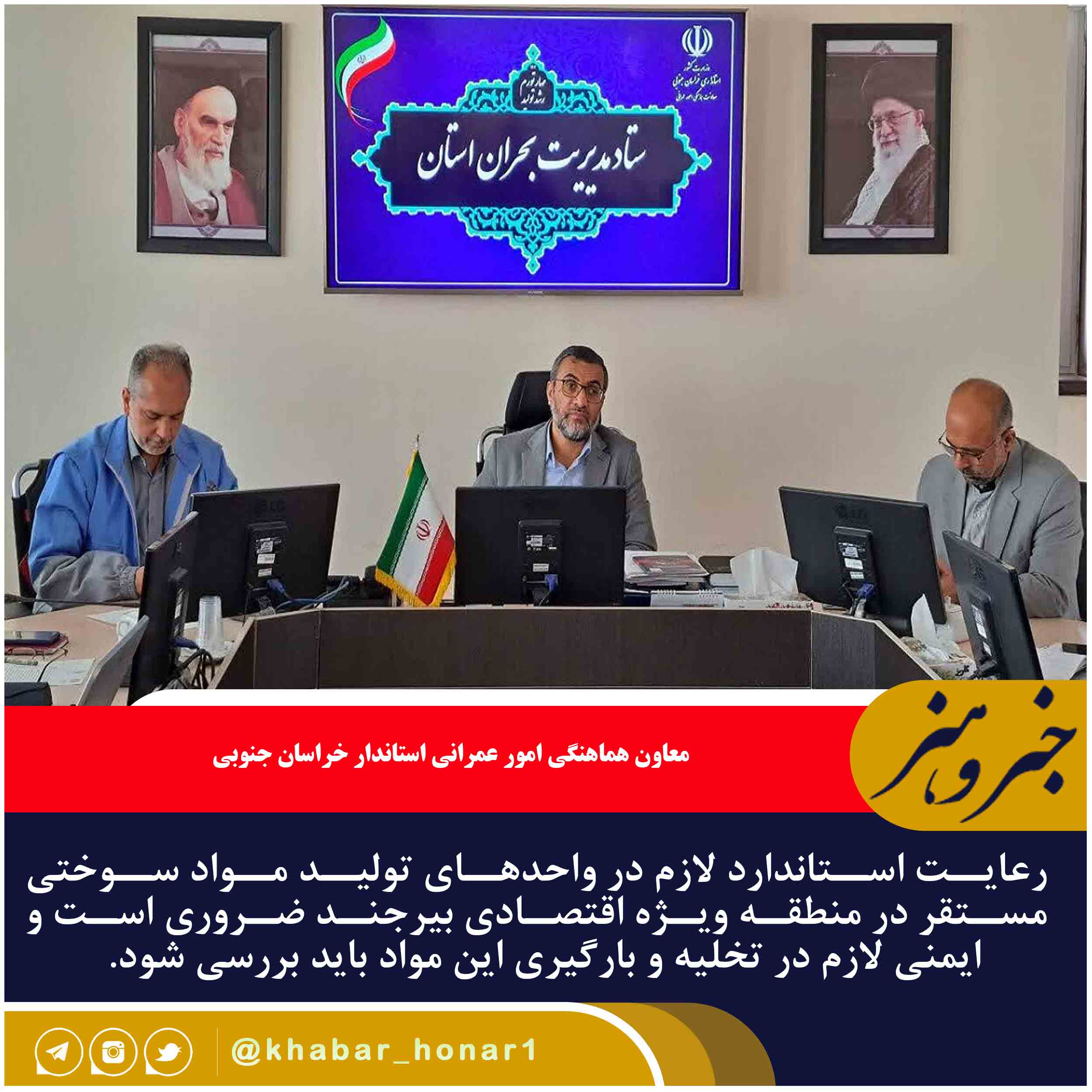معاون هماهنگی امور عمرانی استاندار خراسان جنوبی گفت: رعایت استاندارد لازم در واحدهای تولید مواد سوختی مستقر در منطقه ویژه اقتصادی بیرجند ضروری است و ایمنی لازم در تخلیه و بارگیری این مواد باید بررسی شود.