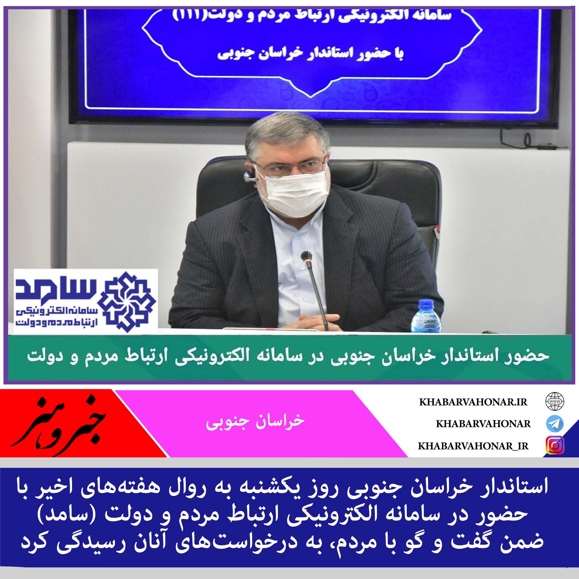 استاندار خراسان جنوبی روز یکشنبه به روال هفتههای اخیر با حضور در سامانه الکترونیکی ارتباط مردم و دولت (سامد) ضمن گفت و گو با مردم، به درخواستهای آنان رسیدگی کرد.