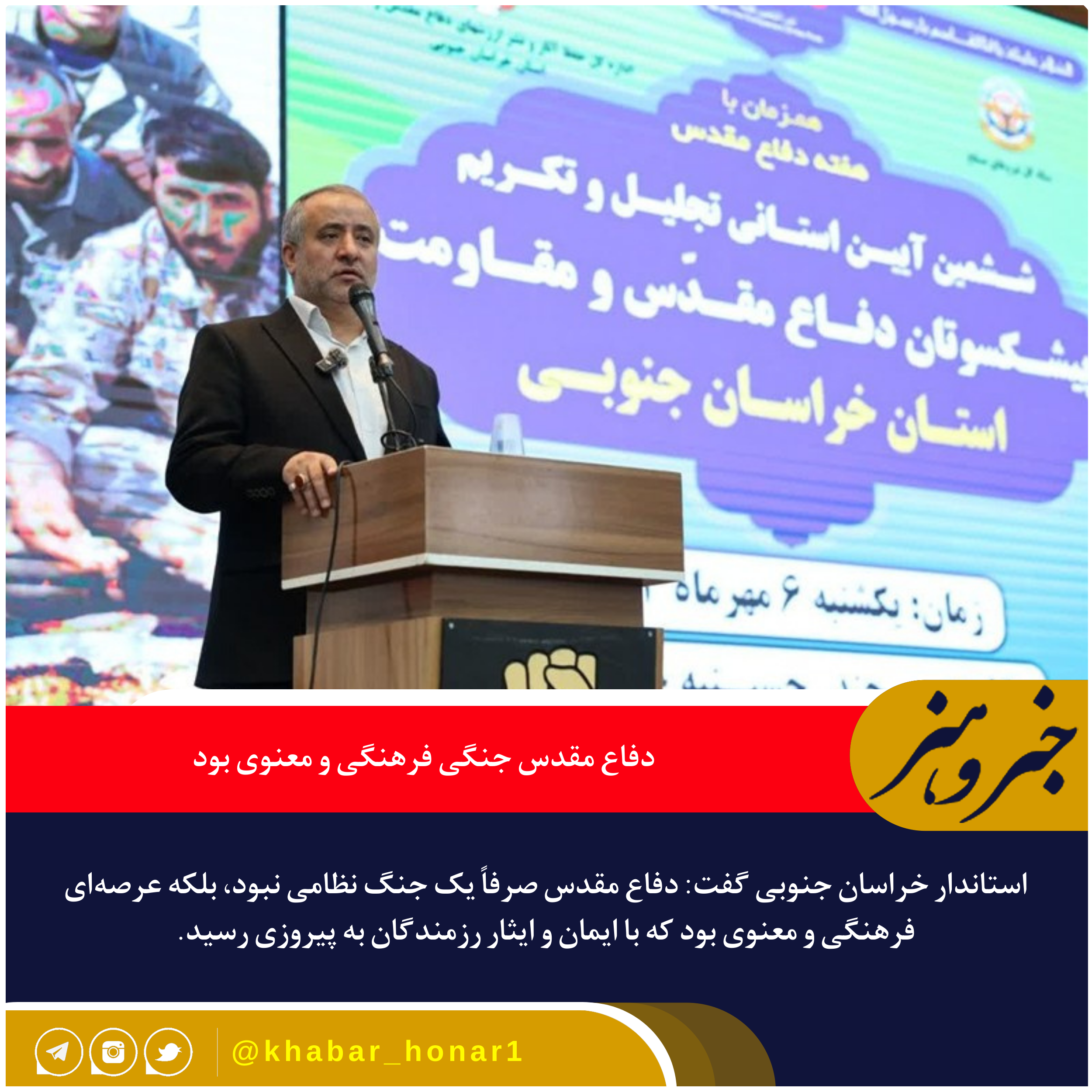 به گزارش خبر و هنر، استاندار خراسان جنوبی گفت: دفاع مقدس صرفاً یک جنگ نظامی نبود، بلکه عرصه‌ای فرهنگی و معنوی بود که با ایمان و ایثار رزمندگان به پیروزی رسید.
