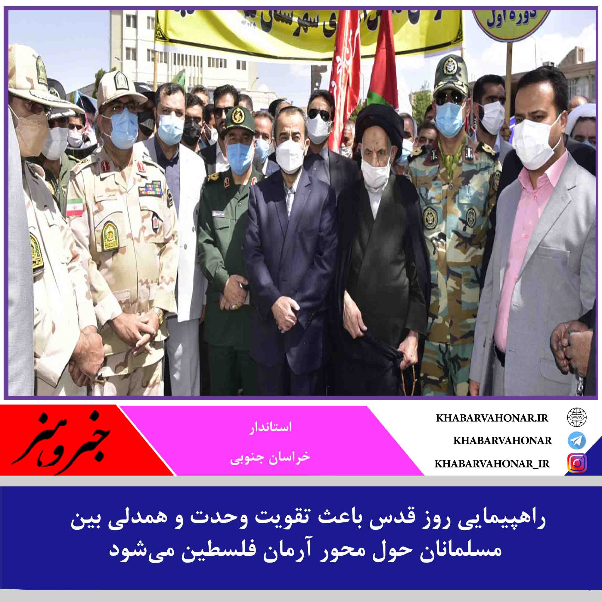 قشرهای مختلف مردم مسیر میدان شهدا، میدان ابوذر، خیابان ارتش، بلوار پاسداران به سمت مسجد امام حسین (ع) را طی می‌کنند و استاندار خراسان جنوبی سخنران مراسم روز قدس در بیرجند است.