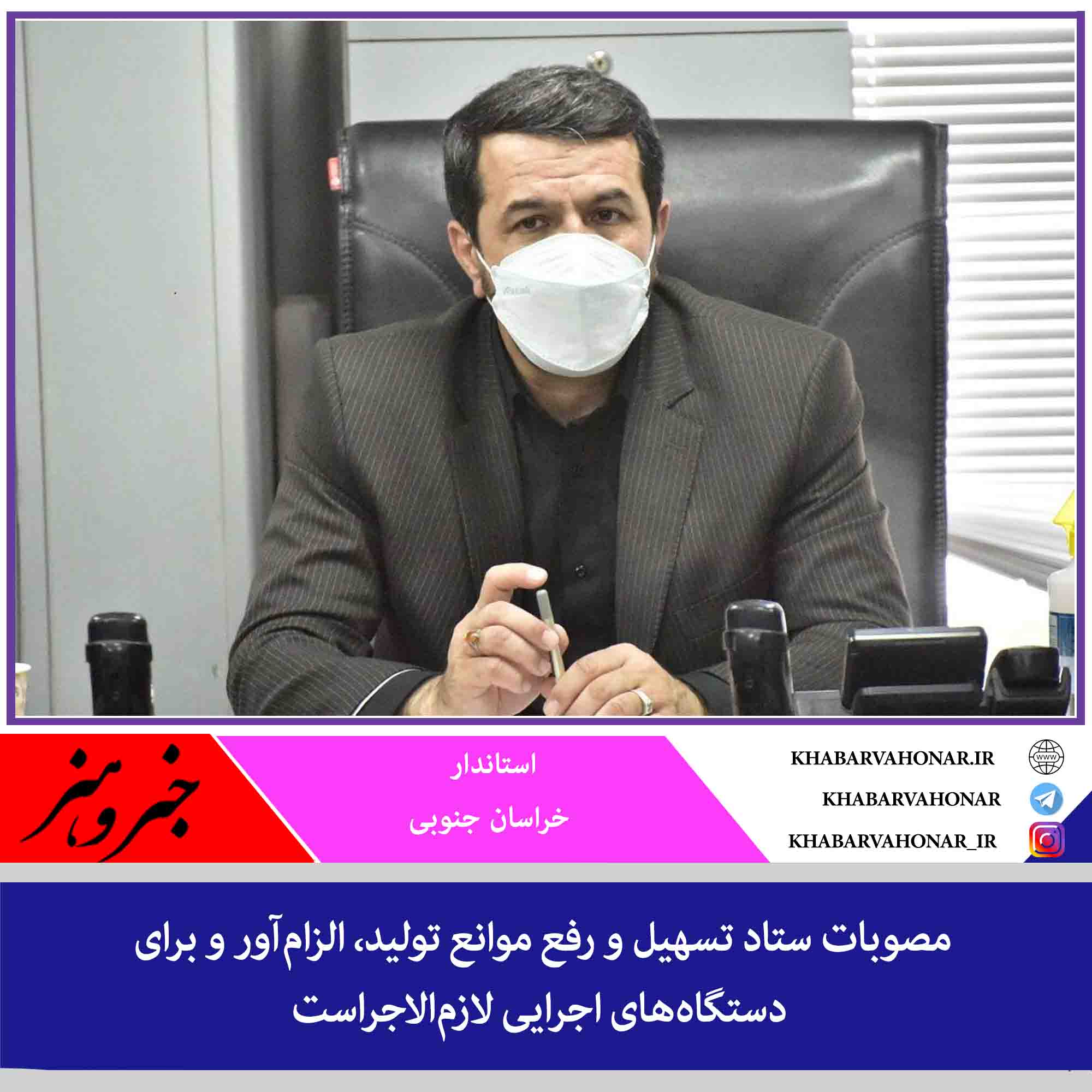استاندار خراسان جنوبی گفت: مصوبات ستاد تسهیل و رفع موانع تولید، الزامآور و برای دستگاههای اجرایی لازمالاجراست.