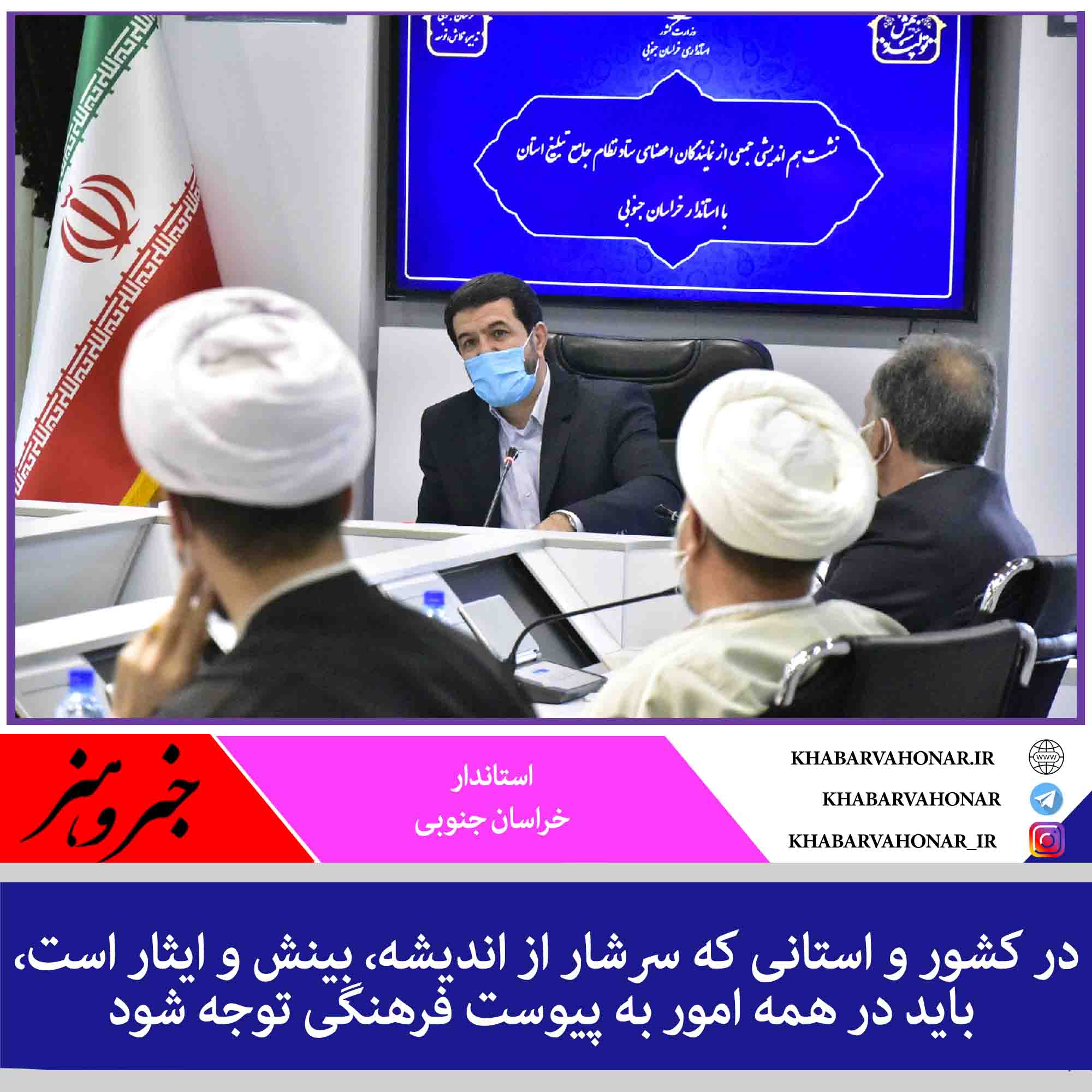 استاندار خراسان جنوبی گفت: در کشور و استانی که سرشار از اندیشه، بینش و ایثار است، باید در همه امور به پیوست فرهنگی توجه شود.