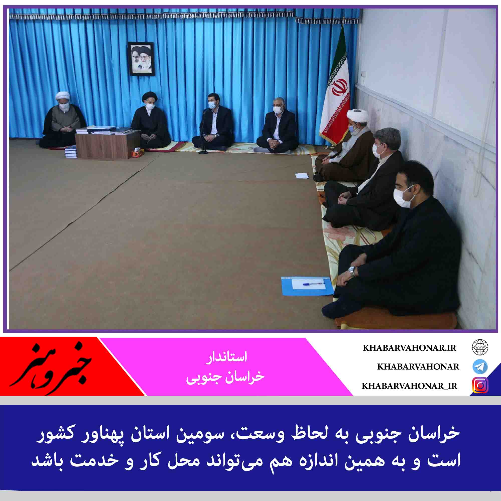 ?استاندار خراسان جنوبی گفت: خراسان جنوبی، به لحاظ وسعت، سومین استان پهناور کشور است و به همین اندازه هم می تواند محل کار و خدمت باشد.