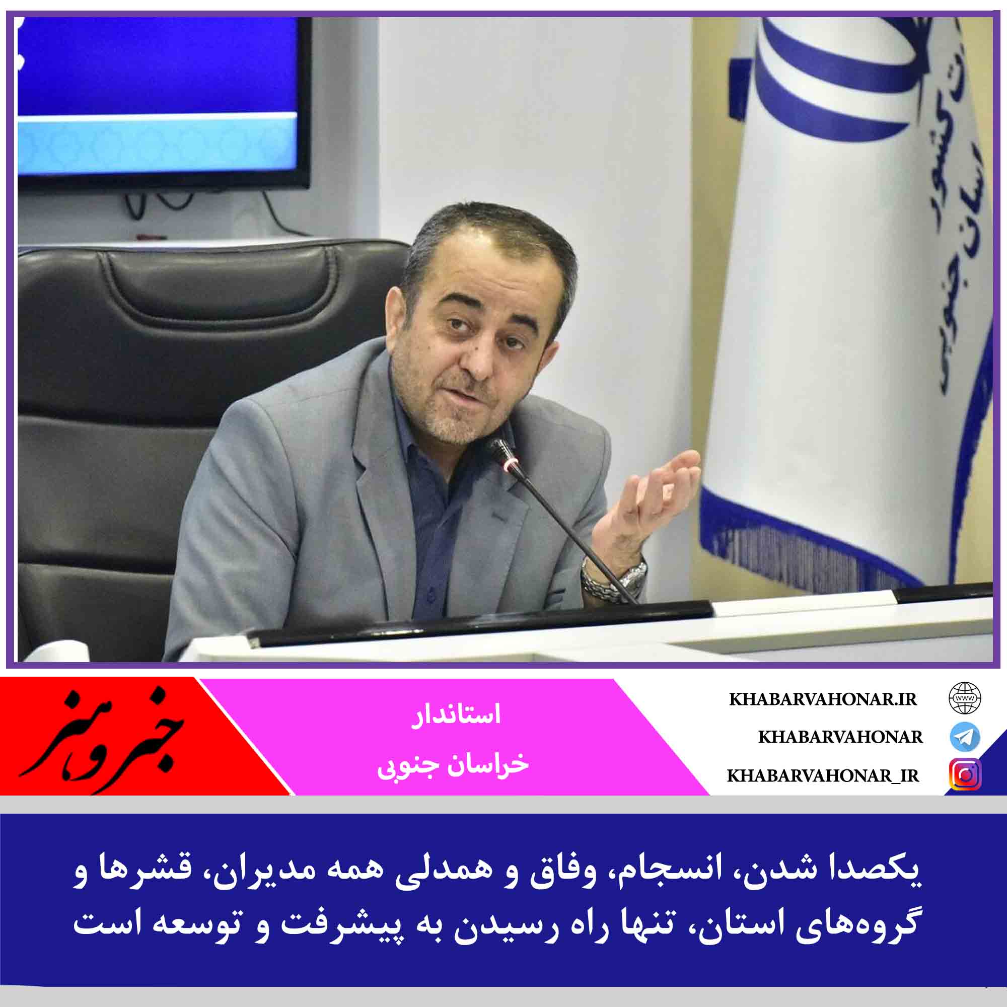 استاندار خراسان جنوبی گفت: یکصدا شدن، انسجام، وفاق و همدلی همه مدیران، قشرها و گروههای استان، تنها راه رسیدن به پیشرفت و توسعه است.