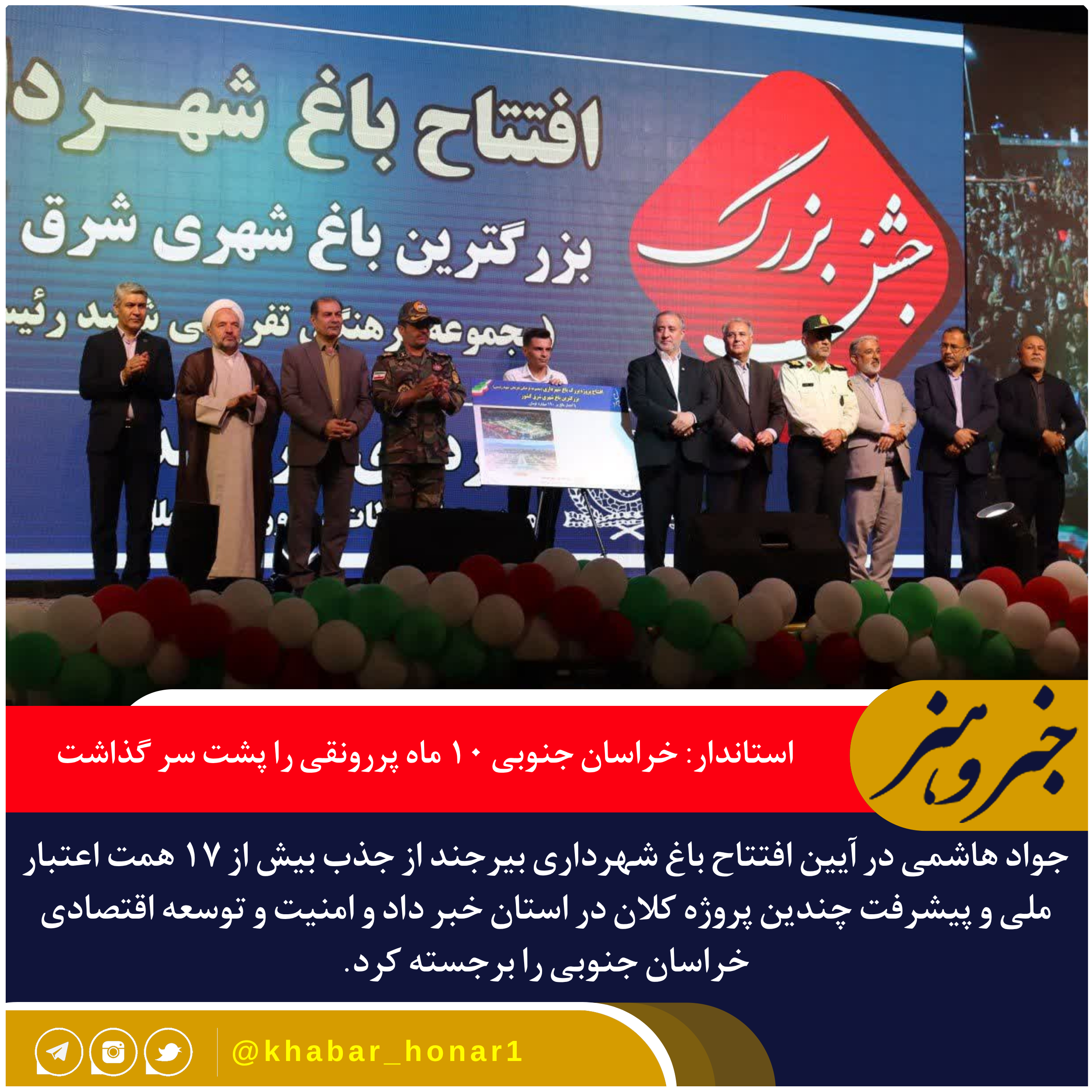 به گزارش «خبر و هنر»، جواد هاشمی، استاندار خراسان جنوبی، شامگاه نهم مهرماه در آیین افتتاح باغ شهرداری بیرجند – بزرگترین باغ شهری شرق کشور و مجموعه فرهنگی تفریحی شهید رئیسی – اعلام کرد که طی ۱۰ ماه گذشته بیش از ۱۷ همت اعتبار ملی برای پروژههای عمرانی استان جذب شده است.