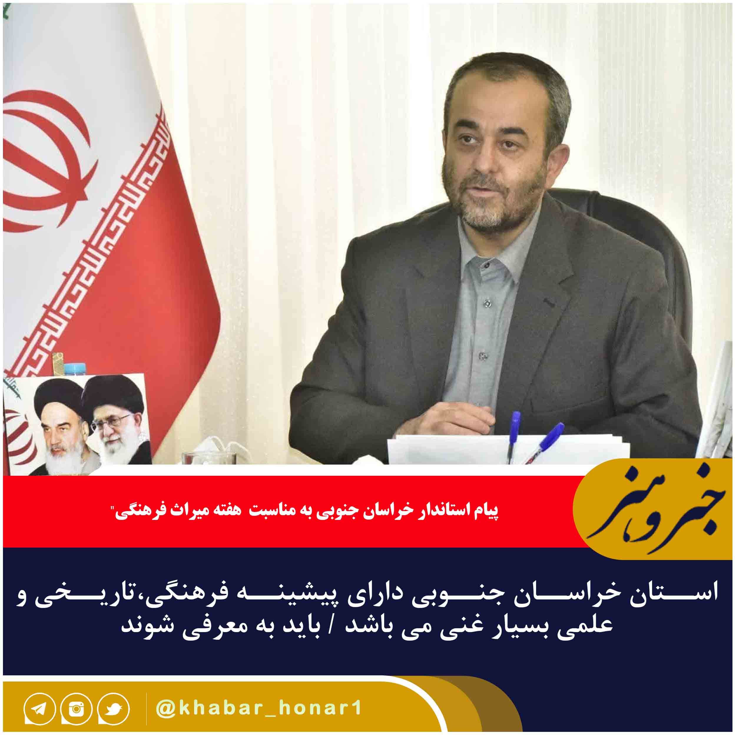 ?اینجانب ضمن گرامیداشت روز جهانی موزه و میراث فرهنگی، هفته میراث فرهنگی را به تمامی فعالان این عرصه در استان خراسان جنوبی که در معرفی، حفظ و احیای میراث گرانقدر این دیار همت می ورزند، تبریک عرض می نمایم.