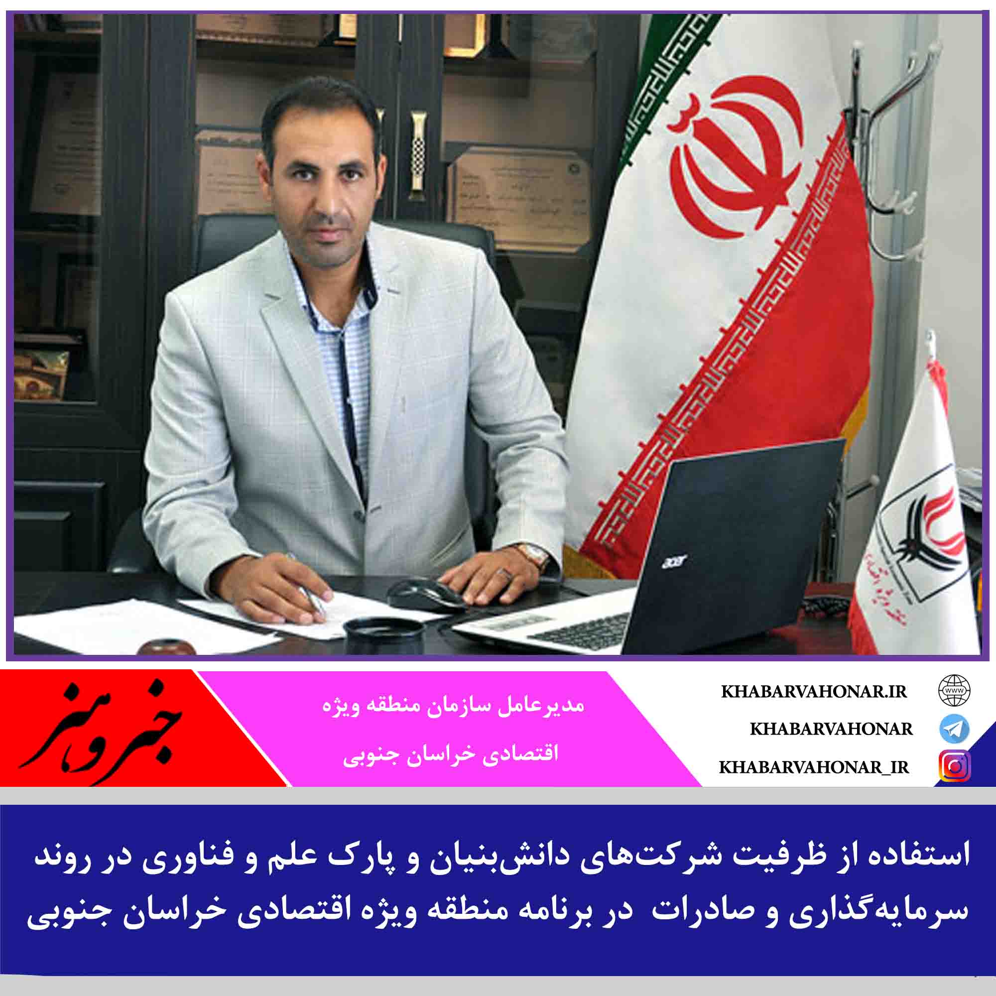 مدیرعامل سازمان منطقه ویژه اقتصادی خراسان جنوبی گفت: با توجه به نامگذاری سال جاری، استفاده از ظرفیت شرکتهای دانشبنیان و پارک علم و فناوری در روند سرمایهگذاری و صادرات را در برنامه داریم.