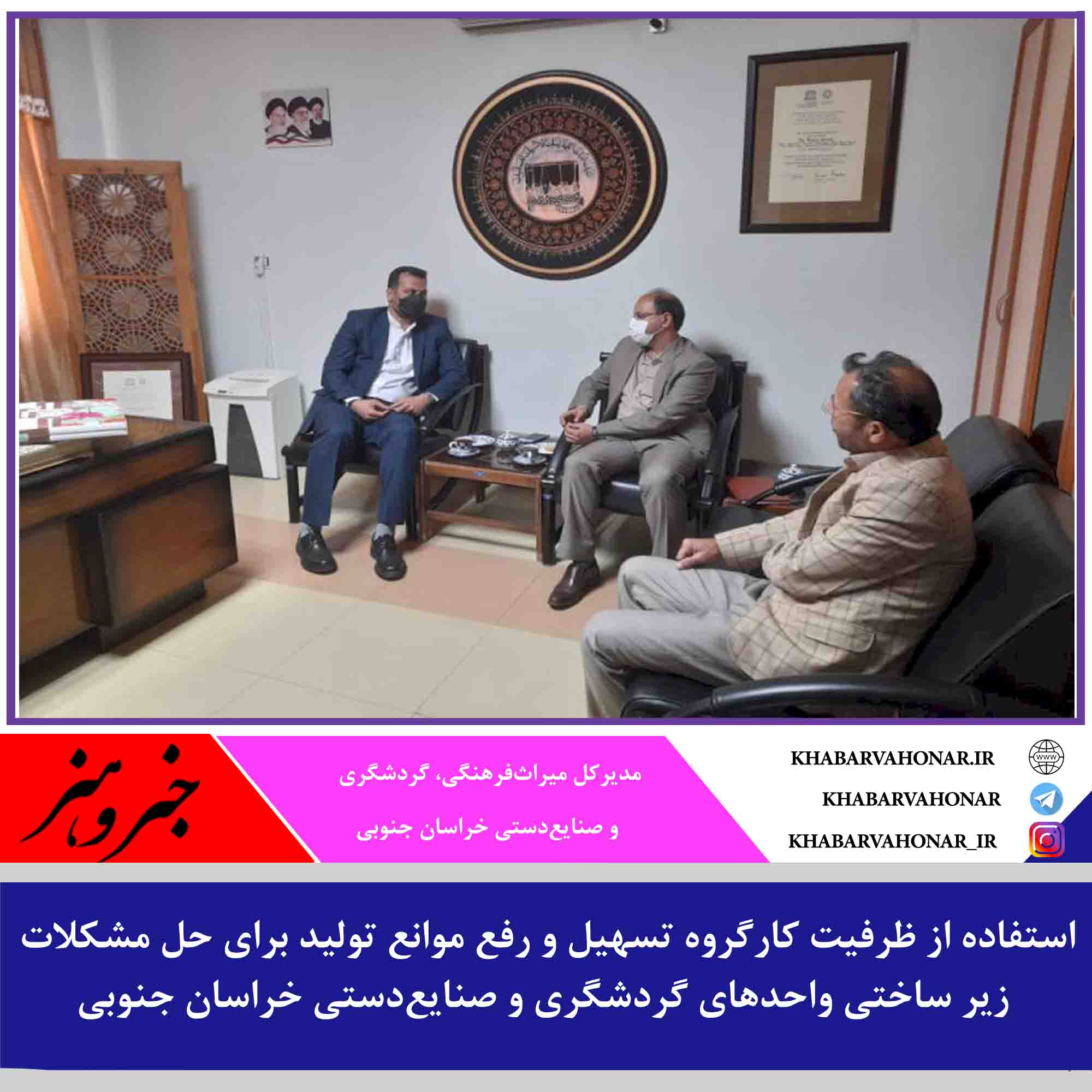 در دیدار سرپرست دفتر حمایت از سرمایهگذاری و اشتغال استانداری خراسان جنوبی با مدیرکل میراثفرهنگی، گردشگری و صنایعدستی در استفاده از از ظرفیت کارگروه تسهیل و رفع موانع تولید برای حل مشکلات زیر ساختی واحدهای گردشگری و صنایع دستی استان تاکید شد.