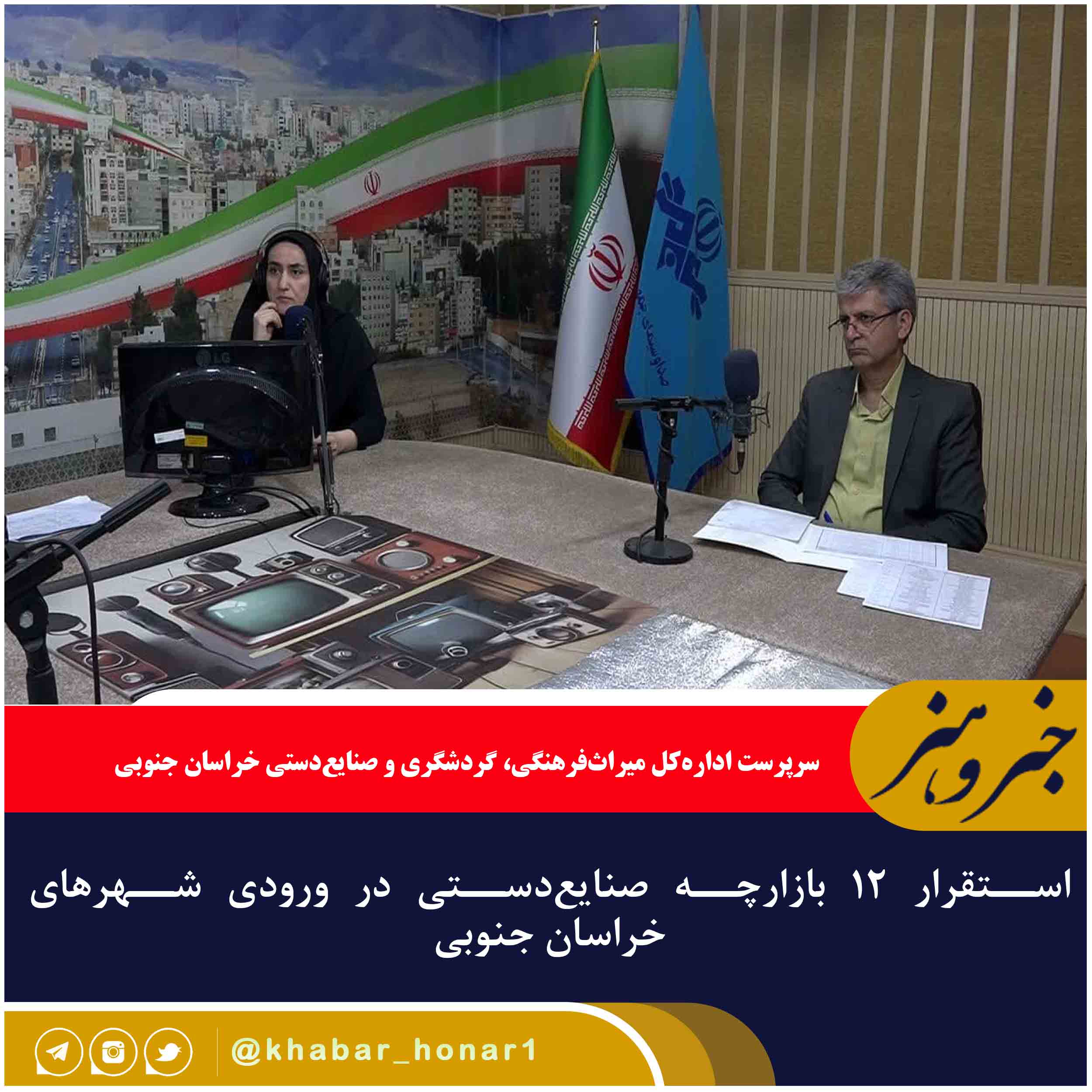 سیداحمد برآبادی در برنامه زنده رادیویی میز خبر شبکه خاوران، با اشاره به اینکه در خراسان جنوبی گردشگری از موضوعات مهم برای معرفی شاخصهای فرهنگی و اجتماعی استان است، بیان کرد: استقرار ۱۲ بازارچه صنایعدستی در نزدیکی ورودی شهرها از مصوبات ستاد سفر استان است که با این اقدام هم مسافران توقفی برای استراحت داشته باشند و هم صنایعدستی استان به مسافران معرفی و عرضه شود.
