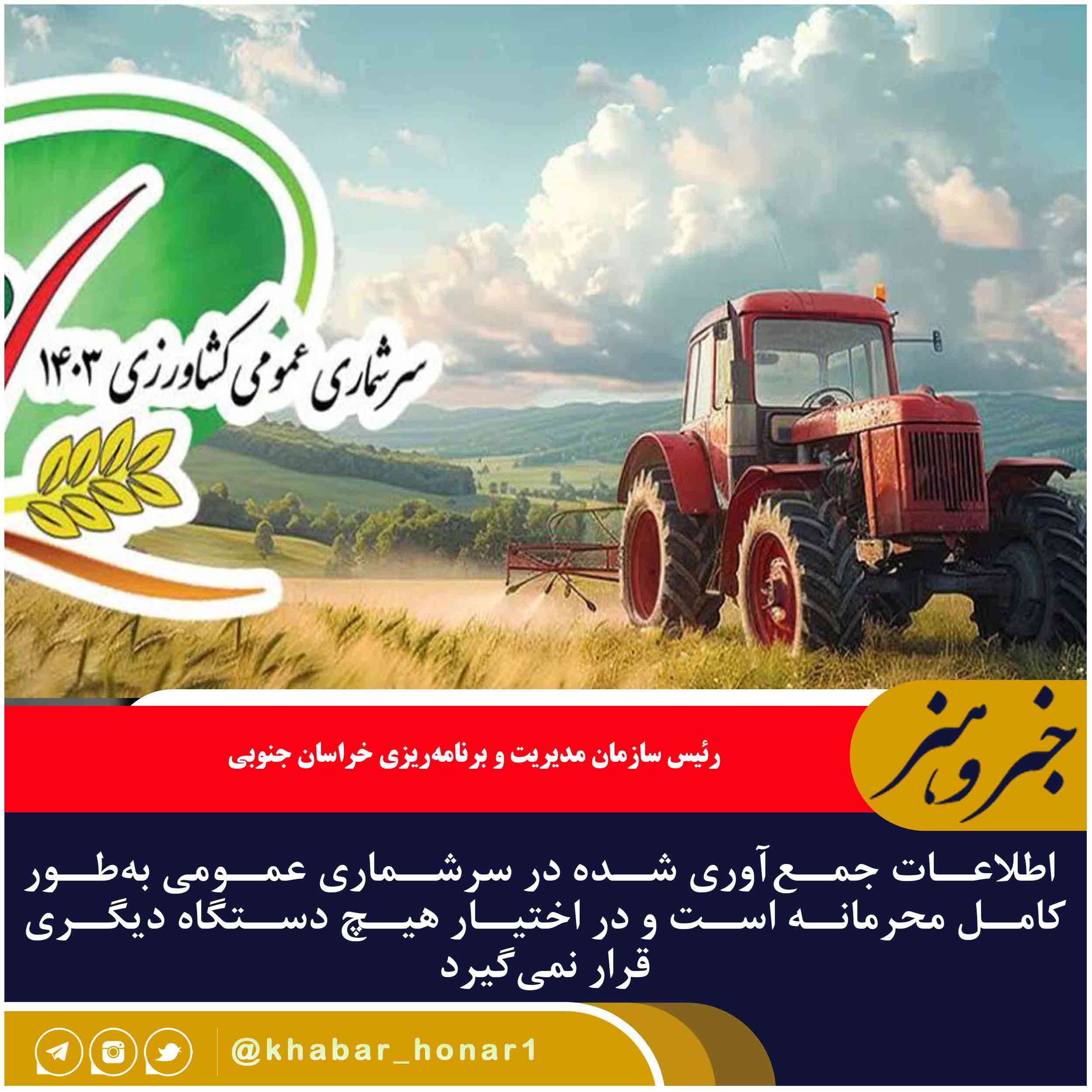 رئیس سازمان مدیریت و برنامهریزی خراسان جنوبی گفت: اطلاعات جمعآوری شده در سرشماری عمومی کشاورزی در استان بهطور کامل محرمانه است و در اختیار هیچ دستگاه دیگری قرار نمیگیرد.