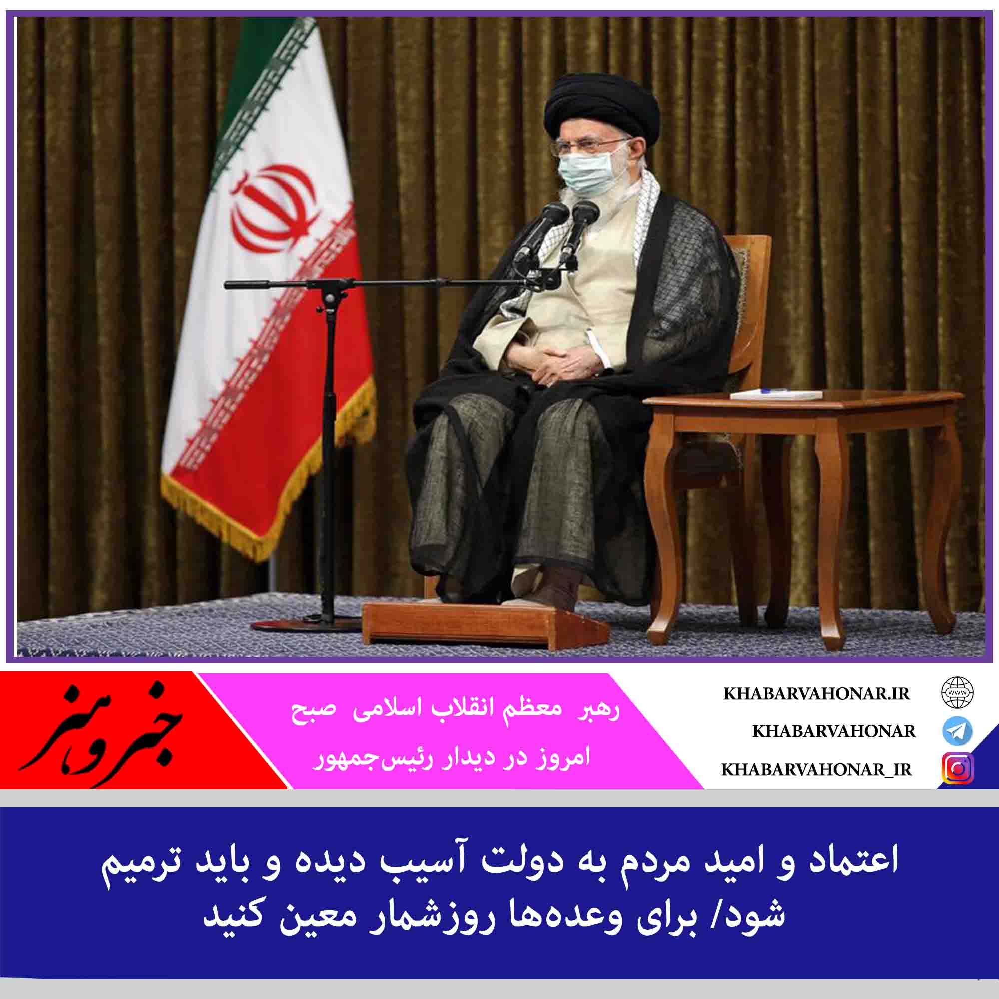 ?رهبر معظم انقلاب اسلامی صبح امروز در دیدار رئیسجمهور و هیئت دولت سیزدهم: مسئله احیای اعتماد مردم و امید مردم بسیار مهم است. چون اعتماد مردم بزرگترین سرمایهی دولت است. مردم وقتی به شما اعتماد کردند و امید به شما داشتند با شما راه میآیند، کمکتان میکنند. این بزرگترین سرمایه است برای یک دولت که بتواند اعتماد مردم را جلب کند، که خب البته این متأسفانه یک مقداری آسیب دیده، این بایست ترمیم کنید این را و راهکارش هم این است که حرف و عمل مسئولین یکی باشد.