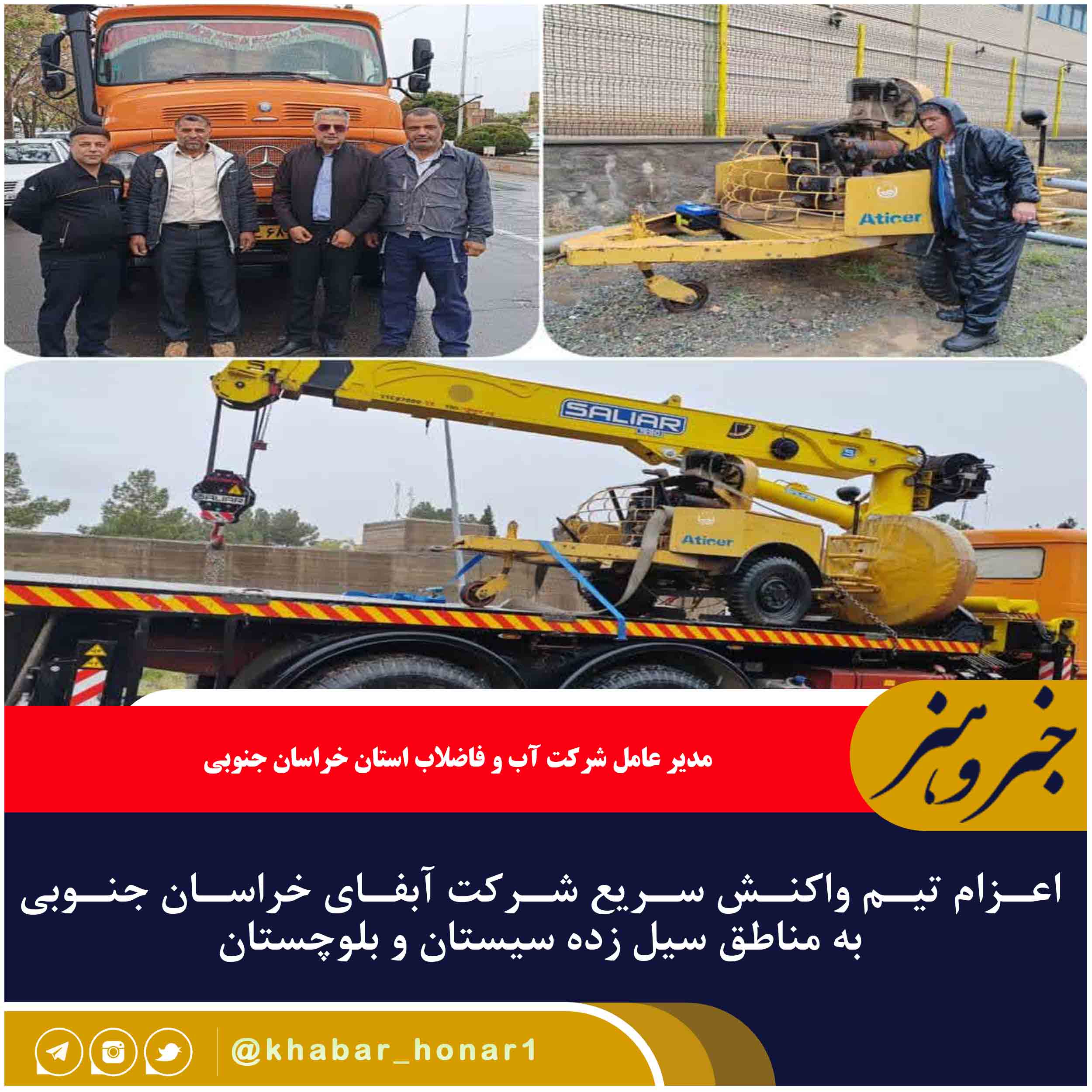 مدیر عامل شرکت آب و فاضلاب استان خراسان جنوبی اظهار کرد: پیرو بارندگی شدید در استان سیستان و بلوچستان و ابلاغیه شرکت مهندسی آبفای کشور سریعا نسبت به تشکیل ۵ تیم واکنش سریع در استان و تجهیز آن جهت مقابله با رخدادهای احتمالی جوی و اعزام یک تیم واکنش سریع به مناطق سیل زده جنوب استان سیستان و بلوچستان اقدام گردید.